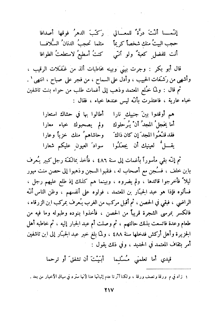 ثم قال: ولما خلع المعتمد وذهب إلى أغمات طلب من حواء بنت تاشفين خباء عارية، فاعتذرت بأنها ليس عندها خباء، فقال: