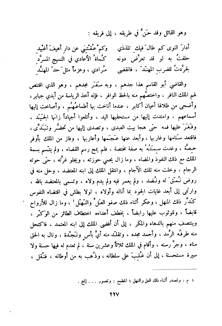 والقاضي أبو القاسم هذا جدهم، وبه سفر مجدهم، وهو الذي اقتنص لهم الملك النافر، واختصهم منه بالحظ الوافر، فإنه أخذ الرياسة من أيدي جبابر، وأضحى من ظلالها أعيان أكابر، عندما أناخت بها أطماعهم، وأصاخت إليها أسماعهم، وامتدت إليها من مستحقيها اليد، وأتلعوا أجياد زانها الجيد، وفغر عليها فمه حتى هجا بيت العبدى، وتصدى إليها من تحضر وتبدى، فاقتعد سنامها وغاربها، وأبعد عنها عجمها وأعاربها، وفاز من الملك بأوفر حصة، وغدت سمته به صفة مختصة، فلم يمح رسم القضاء، ولم يتسم بسمة الملك مع ذلك النفوذ والمضاء، وما زال يحمي حوزته، ويجلو غرته، حتى حوته الرجام، وخلت منه تلك الآجام، وانتقل الملك إلى ابنه المعتضد، وحل منه في روض نمق له ونضد، ولم يعمر فيه ولم يدم ولاه، وتسمى بالمعتضد بالله، وارتمى إلى أبعد غايات الجود بما أناله وأولاده، لولا بطش في اقتضاء النفوس كدر ذلك المنهل، وعكر أثناء ذلك صفو العل والنهل (1) ، وما زال للأرواح قابضاً، وللوثوب عليها رابضاً، يخطف أعداءه اختطاف الطائر من الوكر، وينتصف منهم بالدهاء والمكر، إلى أن أفضى الملك إلى ابنه المعتمد، فاكتحل منه طرفه الرمد، وأحمد مجده، وتقلد منه أي بأس ونجدة، ونال به الحق مناه، وجر رسنه، وأقام في الملك ثلاثاً وعشرين سنة، لم تعدم له فيها حسنة ولا سيرة مستحسنة، إلى أن غلب على سلطانه، وذهب به من أوطانه، فنقل،