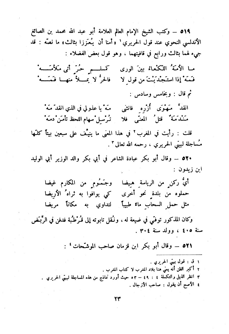519 - وكتب الشيخ الإمام العالم العلامة أبو عبد الله محمد بن الصائغ الأندلسي النحوي عند قول الحريري (1) " أمنا أن يعززا بثالث " مانصه: قد جيء لهما بثالث ورابع في قافيتهما، وهو قول بعض الفضلاء: