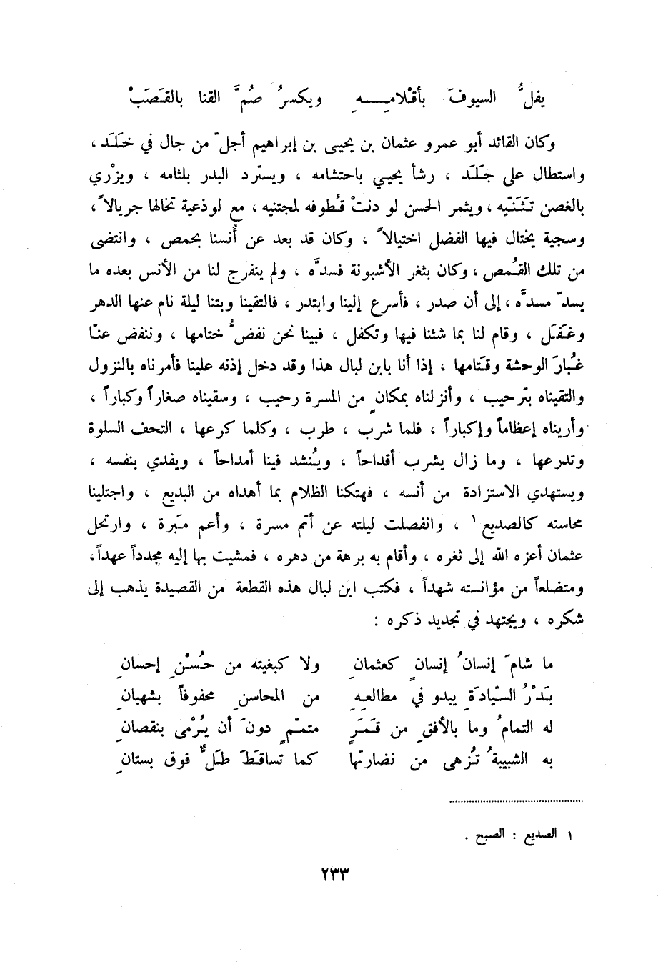 وكان القائد أبو عمرو عثمان بن يحيى بن إبراهيم أجل من جال في خلد، واستطال على جلد، رشأ يحيى باحتشامه، ويسترد البدر بلثامه، ويزري بالغصن تثنيه، ويثمر الحسن لو دنت قطوفه لمجتنيه، مع لوذعية تخالها جريالا، وسجية يختال فيها الفضل اختيالا، وكان قد بعد عن أنسنا بحمص، وانتضى من تلك القمص، وكان بثغر الأشبونة فسده، ولم ينفرج لنا من الأنس بعده ما يسد مسده، إلى أن صدر، فأسرع إلينا وابتدر، فالتقينا وبتنا ليلة نام عنها الدهر وغفل، وقام لنا بما شئنا فيها وتكفل، فبينا نحن نفض ختامها، وننفض عنا غبار الوحشة وقتامها، إذا أنا بابن لبال هذا وقد دخل إذنه علينا فأمرناه بالنزول والتقيناع بترحيب، وأنزلناه بمكان من المسرة رحيب، وسقيناه صغاراً وكباراً، وأريناه إعظاماً وإكباراً، فلما شرب، طرب، وكلما كرعها، التحف السلوة وتدرعها، ومازال يشرب أقداحاً، وينشد فينا أمداحاً، ويفدي بنفسه، ويستهدي الاستزادة من أنسه، فهتكنا الظلام بما أهداه من البديع، واجتلينا محاسنه كالصديع (1) ، وانفصلت ليلته عن أتم مسرة، وأعم مبرة، وارتحل عثمان أعزه الله إلى ثغره، وأقام به برهة من دهره، فمشيتبها إليه مجدداً عهداً، ومتضلعاً من مؤانسته شهداً، فكتب ابن لبال هذه القطعة من القصيدة يذهب إلى شكره، ويجتهد في تجديد ذكره:
