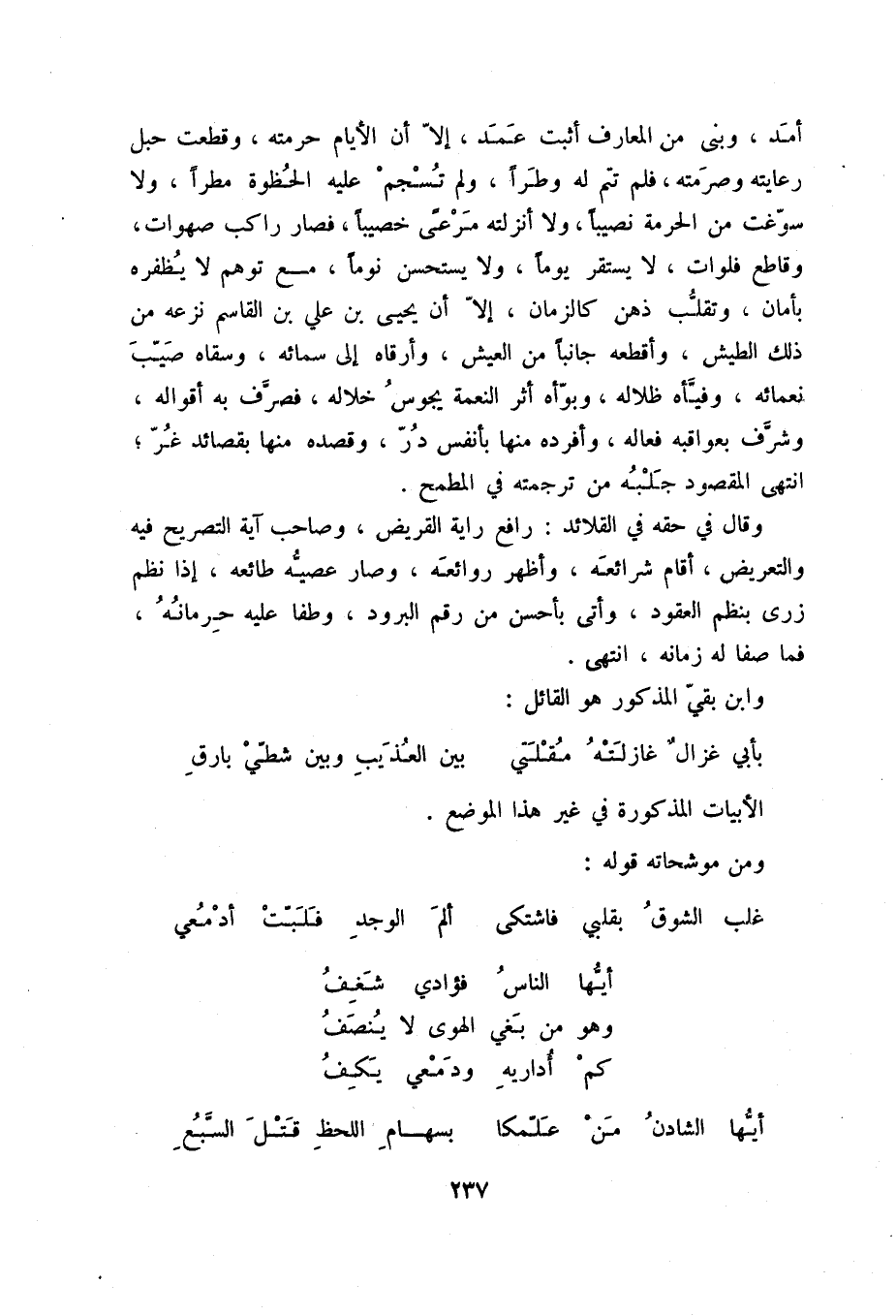 أمد، وبنى من المعارف أثبت عمد، إلا أن الأيام حرمته، وقطعت حبل رعايته وصرمته، فلم تتم له وطراً، ولم تسجم عليه الحظوة مطراً، ولا سوغت من الحرمة نصيباً، ولا انزلته مرعى خصيباً، فصار راكب صهوات، وقاطع فلوات، لا يستقر يوماً، ولا يستحسن نوماً، مع توهم لا يظفره بأمان، وتقلب ذهن كالزمان، إلا أن يحيى بن علي بن القاسم نزعه من ذلك الطيش، وأقطعه جانباً من العيش، وأرقاه إلى سمائه، وسقاه صيب نعمائه، وفيأه ظلاله، وبوأه أثر النعمة يجوس خلاله، فصرف به أقواله، وشرف بعواقبه فعاله، وأفرده منها بأنفس در، وقصده منها بقصائد غر، انتهى المقصود جلبه من ترجمته في المطمح.