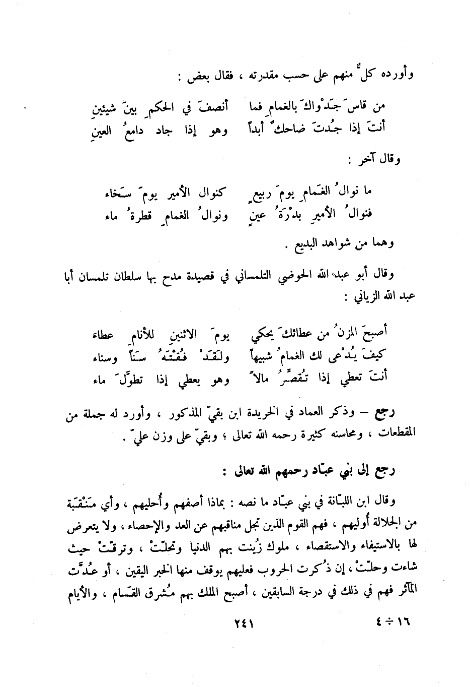 وقال ابن اللبانة في بني عباد ما نصه: بماذا أصفهم وأحليهم، وأي منقبة من الجلالة أوليهم، فهم القوم الذين تجل مناقبهم عن العدل والاحصاء، ولا يتعرض لها بالاستيفاء والاستقصاء، ملوك زينت بهم الدنيا وتحلت، وترقت حيث شاءت وحلت، إن ذكرت الحروب فعليهم يوقف منها الخبر اليقين، أو عدت المآثر فهم في ذلك في درجة السابقين، أصبح الملك بهم مشرق القسام، والأبام