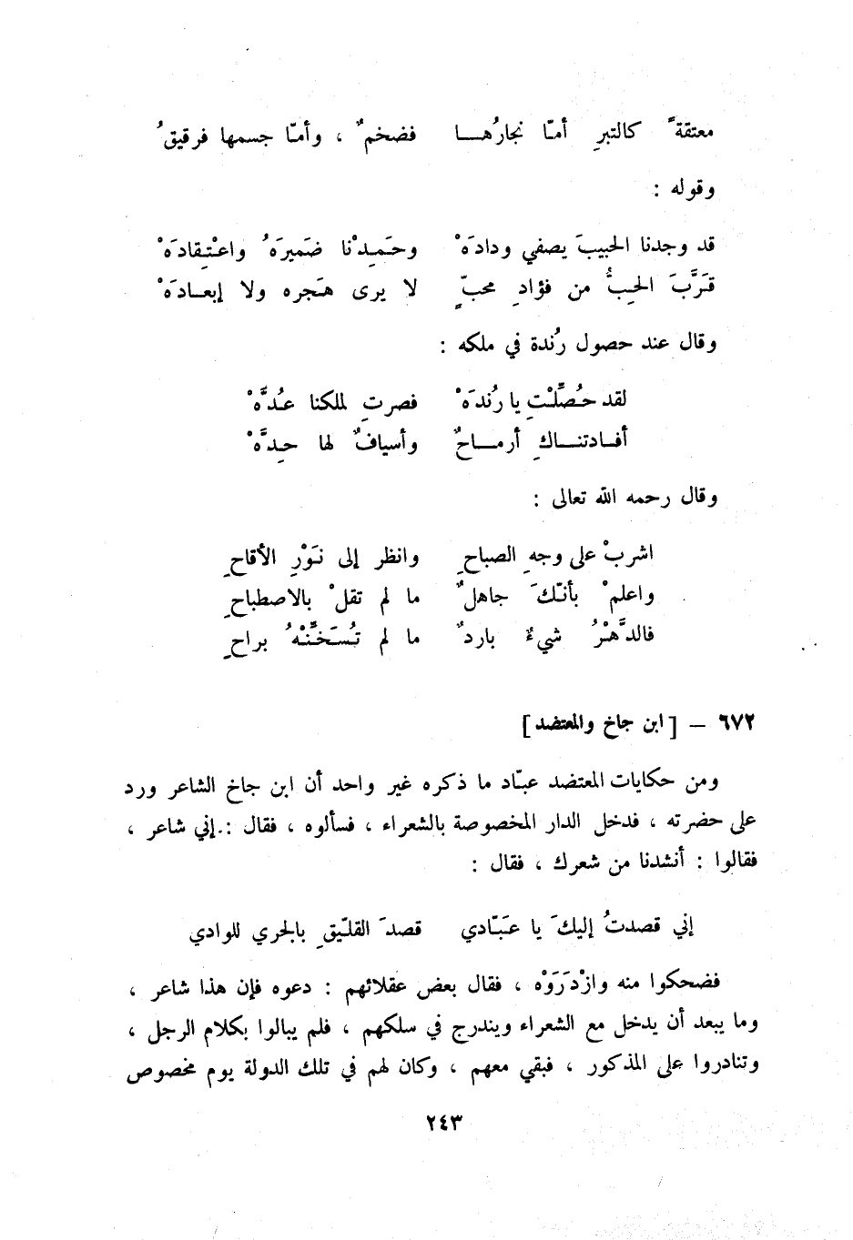 ومن حكايات المعتضد عباد ما ذكره غير واحد أن ابن جاخ الشاعر ورد على حضرته، فدخل الدار المخصوصة بالشعراء، فسألوه، فقال: إني شاعر، فقالوا: أنشدنا من شعرك، فقال: