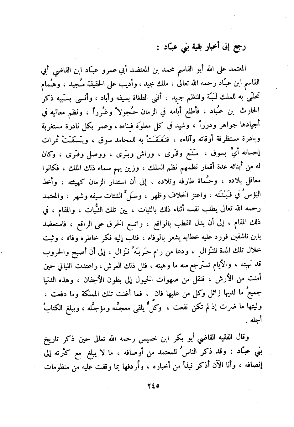 المعتمد على الله أبو القاسم محمد بن المعتضد أبي عمرو عباد ابن القاضي أبي القاسم ابن عباد رحمه الله تعالى، ملك مجيد، وأديب على الحقيقة مجيد، وهمام تحلى به للملك وللنظم جيد، أفنى الطغاة بسيفه وأباد، وأنسى بسيبه ذكر الحارث بن عباد، فأطلع أيامه في الزمان حجولاً وغروراً، ونظم معاليه في أجيادها جواهر ودرراً، وشيد في كل معلوة فناءه، وعمر بكل نادرة مستغربة وبادرة مستظرفة أوقاته وآناءه، فنفقت به للمحامد سوق، وبسقت ثمرات إحسانه أي بسوق، منع وقرى، وراش وبرى، ووصل وفرى، وكان له من أبنائه عدة أقمار نظمهم نظم السلك، وزين بهم سماء ذلك الملك، فكانوا معاقل بلاده، وحماة طارفه وتلاده، إلى أن استدار الزمان كهيئته، وأخذ البؤس في فيئته، واعتز الخلاف وظهر، وسل الشتات سيفه وشهر، والمعتمد رحمه الله تعالى يطلب نفسه أثناء ذلك بالثبات، بين تلك الثبات، والمقام، في ذلك المقام، إلى أن بدل القطب بالواقع، واتسع الخرق على الراقع، فاستعضد بابن تاشفين فورد عليه خطابه يشعر بالوفاء، فثاب إليه فكر خاطره وفاء، وثبت خلال تلك المدة للنزال، ودعا من رام حربه نزال، إلى أن أصبح والحروب قد نهبته، والأيام تسترجع منه ما وهبته، فثل ذلك العرش، واعتدت الليالي حين أمنت من الأرش، فنقل من صهوات الخيول إلى بطون الأجفان، وهذه الدنيا جميع ما لديها زائل وكل من عليها فان، فما أغنت تلك المملكة وما دفعت، وليتها ما ضرت إذ لم تكن نفعت، وكل يلقى معجله ومؤجله، ويبلغ الكتاب أجله.