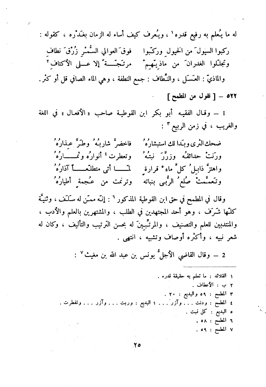 وتعمّمت صلع الرّبى بنباته ... وترنمت من عجمةٍ أطياره وقال في المطمح في حق ابن القوطية المذكور (6) : إنه ممن له سلف، وثنية كلها شرف، وهو أحد المجتهدين في الطلب، والمشتهرين بالعلم والأدب، والمنتدبين للعلم والتصنيف، والمرتبين له بحسن الترتيب والتأليف، وكان له شعر نبيه، وأكثره أوصاف وتشبيه، انتهى.
