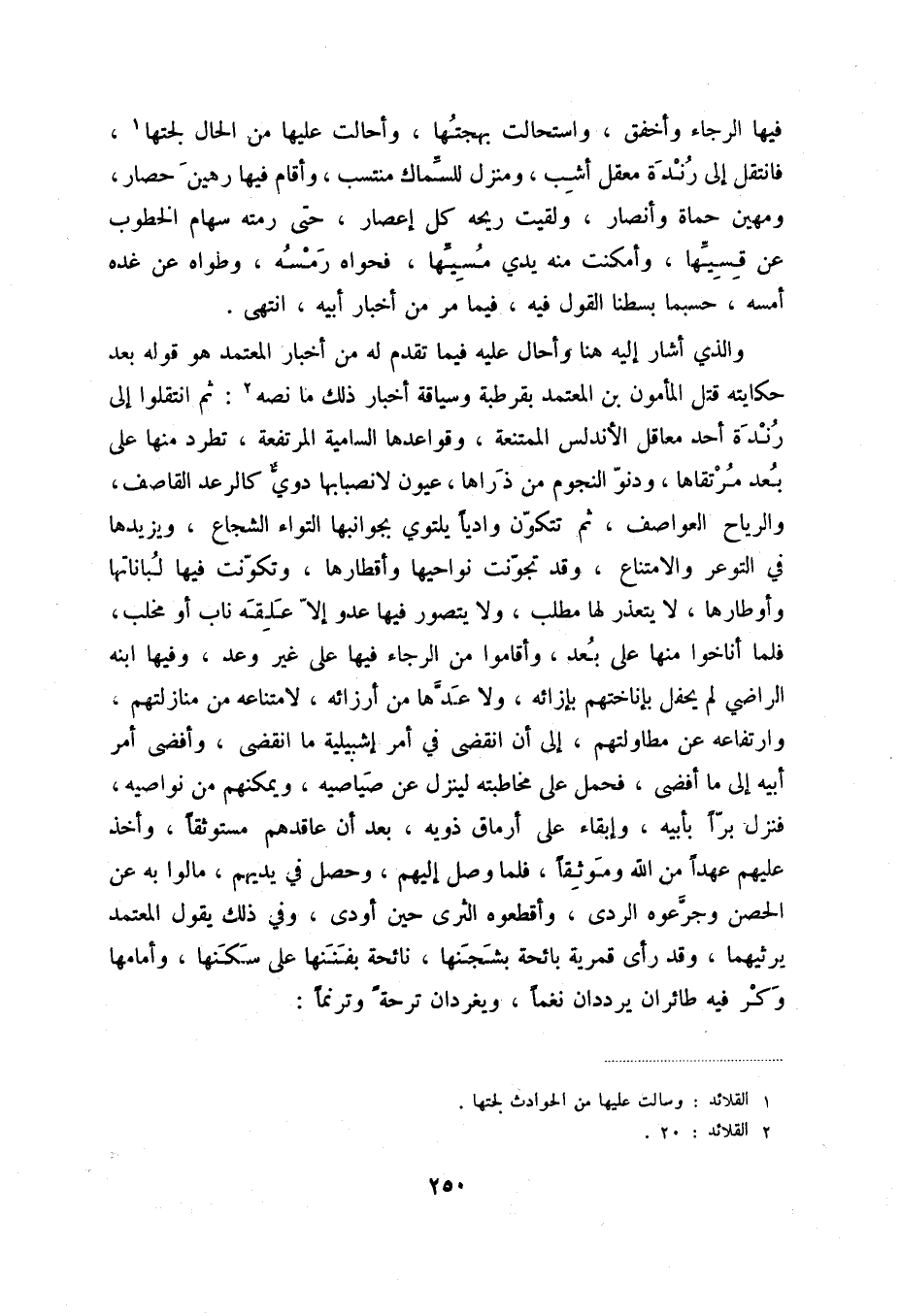 والذي أشار إليه هنا وأحال عليه فيما تقدم له من أخبار المعتمد هو قوله بعد حكايته قتل المأمون بن المعتمد بقرطبة وسياقه أخبار ذلك ما نصه (2) : ثم انتقلوا إلى رندة أحد معاقل الأندلس الممتنعة، وقواعدها السامية المرتفعة، تطرد منها على بعد مرتقاها، ودنو النجوم من ذراها، عيون لانصبابها دوي كالرعد القاصف، والرياح العواصف، ثم تتكون وادياً يلتوي بجوانبها التواء الشجاع، ويزيدها في التوعر والامتناع، وقد تجونت نواحيها وأقطارها، وتكونت فيها لباناتها وأوطارها، لا يتعذر لها مطلب، ولا يتصور فيها عدو إلا علقه ناب أو مخلب، فلما أناخوا منها على بعد، وأقاموا من الرجاء فيها على غير وعد، وفيها ابنه الراضي لم يحفل بإناختهم بإزائه، ولا عدها من أرزائه، لامتناعه من منازلتهم، وارتفاعه عن مطاولتهم، إلى أن انقضى في أمر إشبيلية ما انقضى، وأفضى أمر أبيه إلى ما أفضى، فحمل على مخاطبته لينزل عن صياصيه، ويمكنهم من نواصيه، فنزل براً بأبيه، وإبقاء على أرماق ذويه، بعد أن عاقدهم مستوثقاً، وأخذ عليهم عهداً من الله وموثقاً، فلما وصل إليهم، وحصل في يديهم، مالوا به عن الحصن وجرعوه الردى، وأقطعوا الثرى حين أودى، وفي ذلك يقول المعتمد يرثيهما، وقد رأى قمربة بائحة بشجنها، نائحة بفننها على سكنها، وأمامها وكر فيه طائران يرددان نغماً، ويغردان ترحة وترنماً: