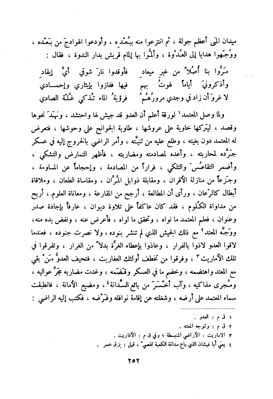ولما وصل المعتمد (1) لورقة أعلم أن العدو قد جيش لها واحتشد، ونهد نحوها وقصد، ليتركها خاوية على عروشها، طاوية الجوانح على وحوشها، فتعرض له المعتمد دون بغيته، وطلع عليه من ثنيته، وأمر الراضي بالخروج إليه في عسكر جرده لمحاربته، وأعده لمصادمته ومضاربته، فأظهر التمارض والتشكي، وأضمر التقاعص والتلكي، فراراً من المصادمة، وإحجاماً عن المساومة، وجزعاً من منازلة الأقران، ومقابلة ذوابل المران، ومقاساة الطعان، وملاقاة أبطال كالرعان، ورأى أن المطالعة، أرجح من المقارعة، ومعانة العلوم، أربح من مداواة الكلوم، فقد كان عاكفاً على تلاوة ديوان، عارفاً بإجادة سطر وعنوان، فعلم المعتمد ما نواه، وتحقق ما لواه، فأعرض عنه، ونفض يده منه، ووجه المعتد (2) مع ذلك الجيش الذي لم تنشر بنوده، ولا نصرت جنوده، فعندما لاقوا العدو لاذوا بالفرار، وعاذوا بإعطاء الغرة بدلاً من الغرار، وتفرقوا في تلك الأماريت (3) ، وفرقوا من تخطف أولئك العفاريت، فتحيف العدو من بقي مع المعتمد واهتضمه، وخضم ما في العسكر وقضمه، وغدت مضاربه مجر عواليه، ومجرى مذاكيه، وآب أخسر من بائع السدانة (4) ، ومضيع الأمانة، فانطبقت سماء المعتمد على أرضه، وشغلته عن إقامة نوافله وفرضه، فكتب إليه الراضي: