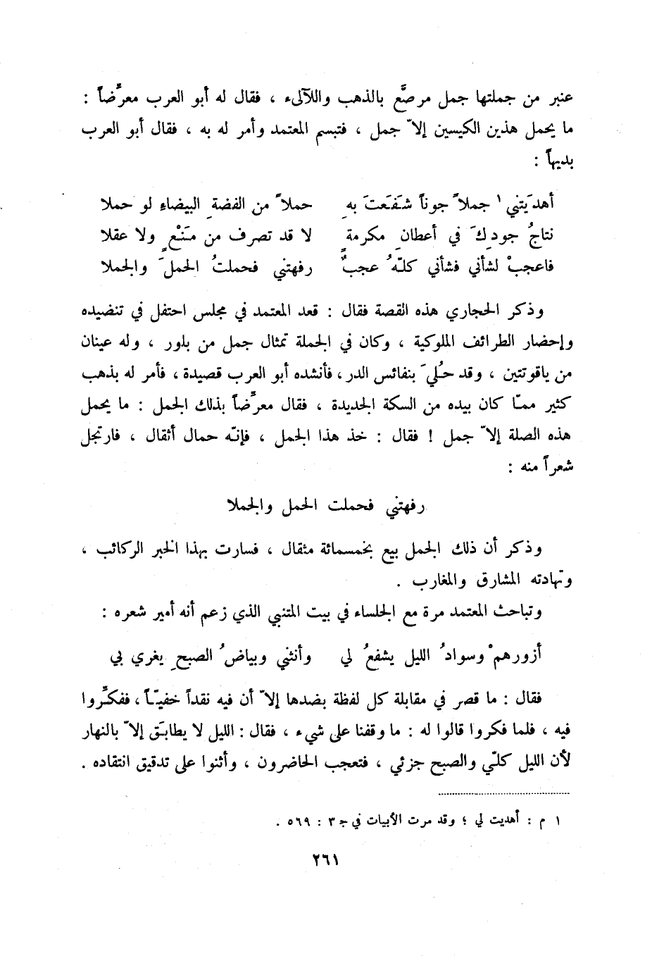 عنبر من جملتها جمل مرصع بالذهب واللآلئ، فقال أبو العرب معرضاً: ما يحمل هذين الكيسين إلا جمل، فابتسم المعتمد وأمر له به، فقال أبو العرب بديهاً:
