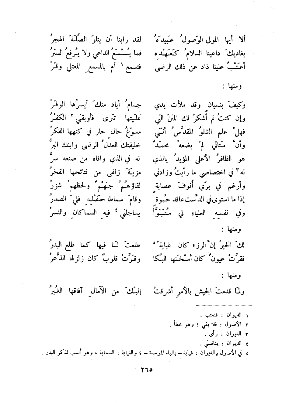 وإن كنت لم أشكر لك المنن التي ... تمليتها تترى فأوبقني (2) الكفر فهل علم الشلو المقدس أنني مسوغ حال حار في كنهها الفكر