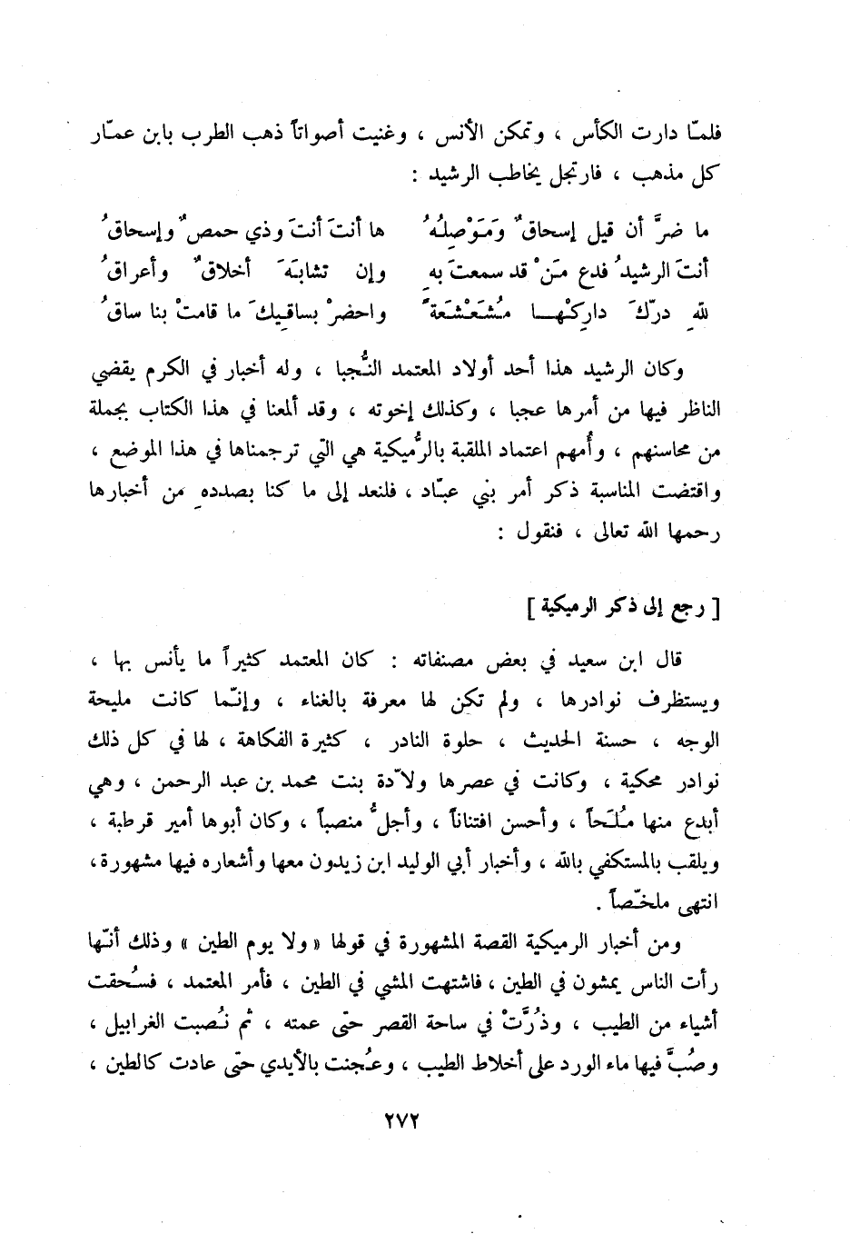 وكان الرشيد هذا أحد أولاد المعتمد النجبا، وله أخبار في الكرم يقضي الناظر فيها من أمرها عجبا، وكذلك إخوته، وقد ألمعنا في هذا الكتاب بجملة من محاسنهم، وأمهم اعتماد الملقبة بالرميكية هي التي ترجمناها في هذا الموضع، واقتضت المناسبة ذكر أمر بني عباد، فلنعد إلى ما كنا بصدده من أخبارها رحمها الله تعالى، فنقول: