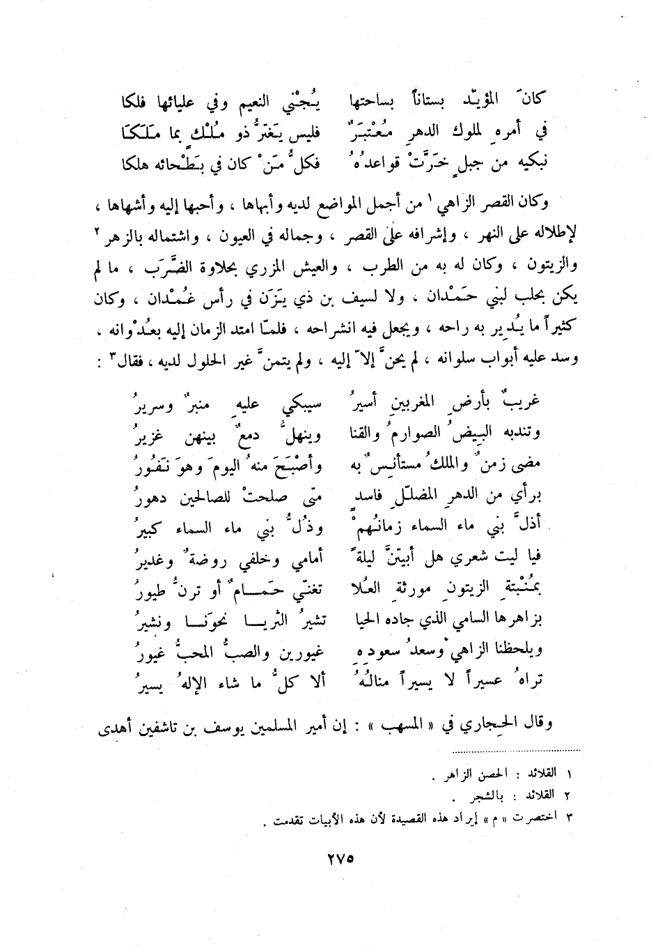 وكان القصر الزاهي (1) من أجمل المواضع لديه وأبهاها، وأحبها إليه وأشهاها، لإطلاله على النهر، وإشرافه على القصر، وجماله في العيون، واشتماله بالزهر (2) والزيتون، وكان له به من الطرب، والعيش المزري بحلاوة الضرب، ما لم يكن بحلب لبني حمدان، ولا لسيف بن ذي يزن في رأس غمدان، وكان كثيراً ما يدير به راحه، ويجعل فيه انشراحه، فلما امتد الزمان إليه بعدوانه، وسد عليه أبواب سلوانه، لم يحن إلا إليه، ولم يتمن غير الحلول لديه، فقال (3) :
