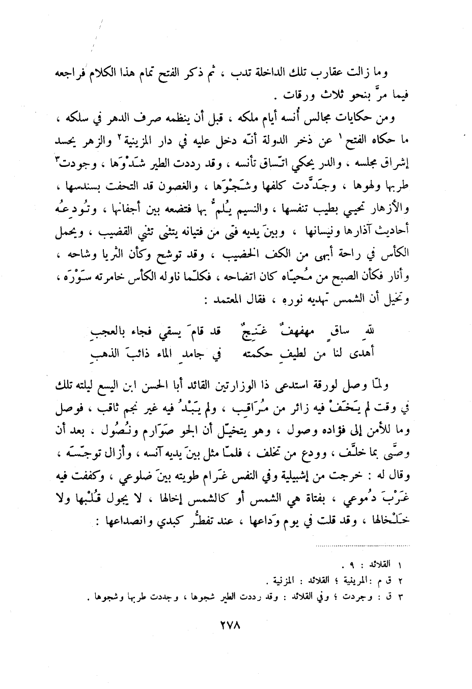 ومن حكايات مجالس أنسه أيام ملكه، قبل أن ينظمه صرف الدهر في سلكه، ما حكاه الفتح (1) عن ذخر الدولة أنه دخل عليه في دار المزينية (2) والزهر يحسد إشراق مجلسه، والدر يحكي اتساق تأنسه، وقد رددت الطير شدوها، وجودت (3) طربها ولهوها، وجددت كلفها وشجوها، والغصون قد التحفت بسندسها، والأزهار تحيي بطيب تنفسها، والنسيم يلم بها فتضعه بين أجفانها، وتودعه أحاديث آذارها ونيسانها، وبين يديه فتى من فتيانه يتثنى تثني القضيب، ويحمل الكأس في راحة أبهى من الكف الخضيب، وقد توشح وكأن الثريا وشاحه، وأنار فكأن الصبح من محياه كان اتضاحه، فكلما ناوله الكأس خامرته سوره، وتخيل أن الشمس تهديه نوره، فقال المعتمد: