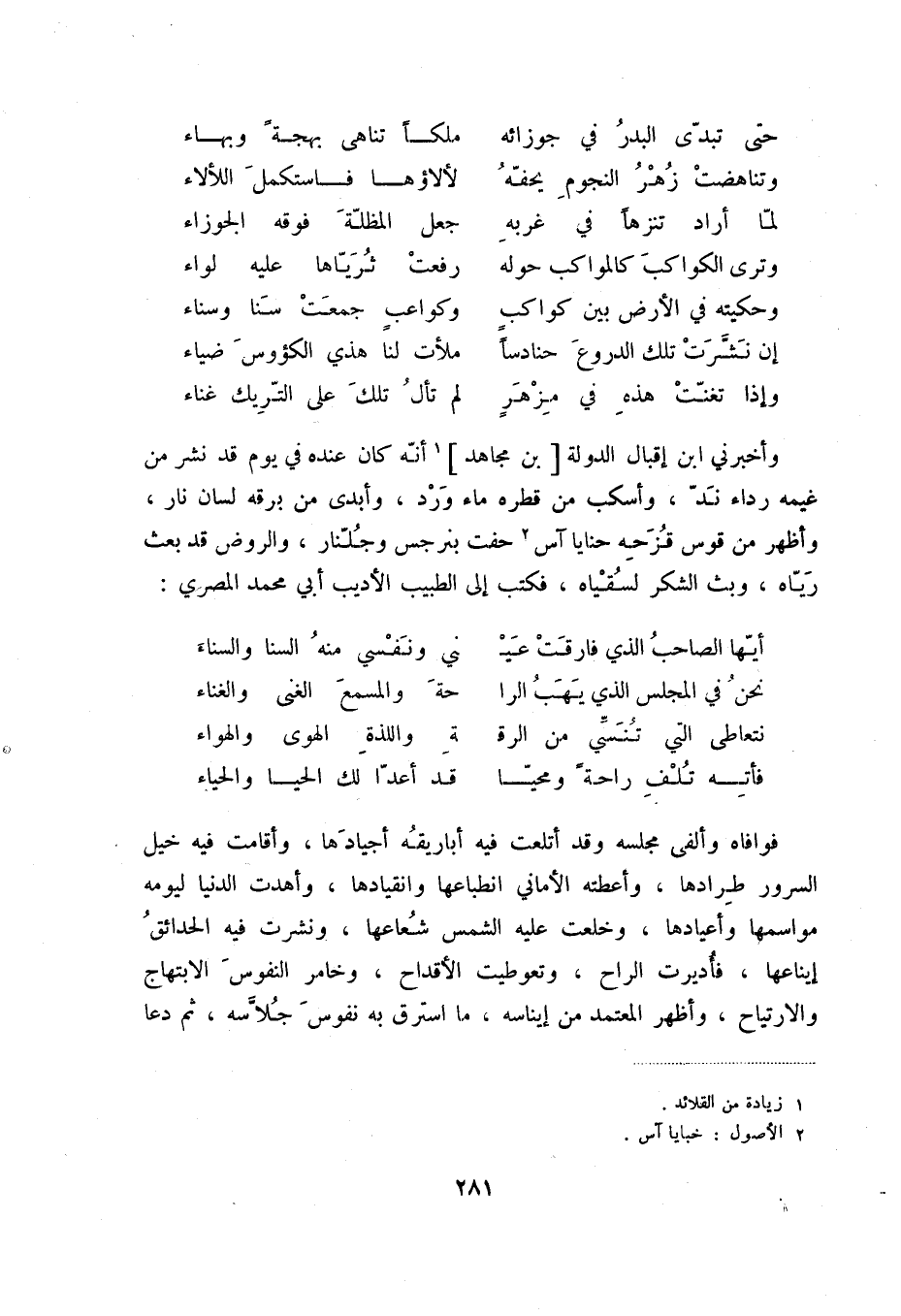 فوافاه وألفى مجلسه وقد أتلعت فيه أباريقه أجيادها، وأقامت فيه خيل السرور طرادها، وأعطته الأماني انطباعها وانقيادها، وأهدت الدنيا ليومه مواسمها وأعيادها، وخلعت عليه الشمس شعاعها، ونشرت فيه الحدائق إيناعها، فأديرت الراح، وتعوطيت الأقداح، وخامر النفوس الابتهاج والارتياح، وأظهر المعتمد من إيناسه، ما استرق به نفوس جلاسه، ثم دعا