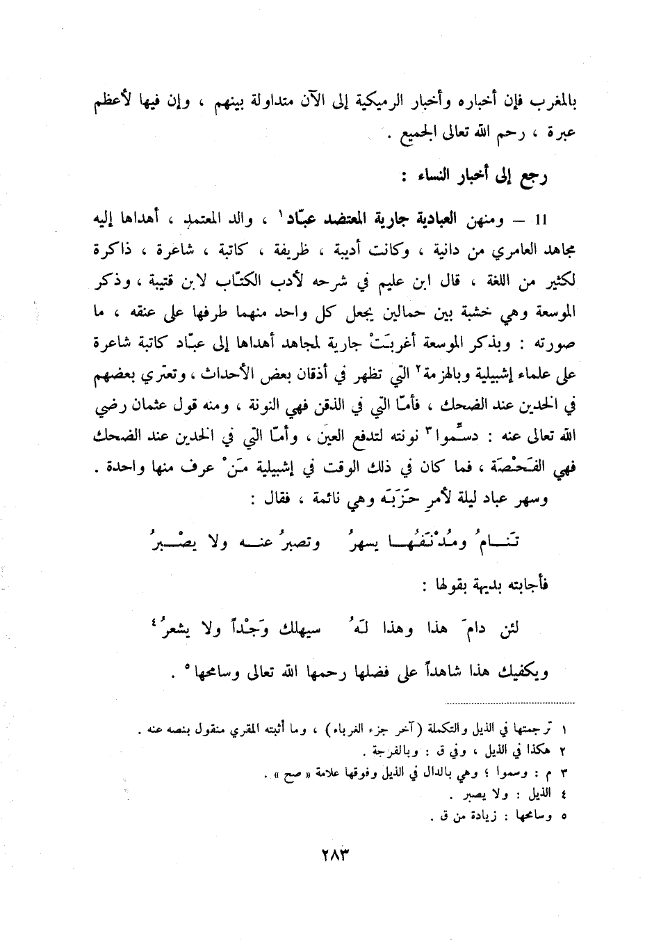 11 - ومنهن العبادية جارية المعتضد عباد (1) ، والد المعتمد، أهداها إليه مجاهد العامري من دانية، وكانت أديبة، ظريفة، كاتبة، شاعرة، ذاكرة لكثير من اللغة، قال ابن عليم في شرحه لأدب الكتاب لابن قتيبية، وذكر الموسعة وهي خشبة بين حمالين يجعل كل واحد منهما طرفها على عنقه، ما صورته: وبذكر الموسوعة أغربت جارية لمجاهد أهداها إلى عباد كاتبة شاعرة على علماء إشبيلية وبالهزمة (2) التي تظهر في أذقان بعض الأحداث، وتعتري بعضهم في الخدين عند الضحك، فأما التي في القن فهي النونة، ومنه قول عثمان رضي الله تعالى عنه: دسموا (3) نونته لتدفع العين، وأما التي في الخدين عند الضحك فهي الفحصة، فما كان في ذلك الوقت في إشبيلية من عرف منها واحدة0