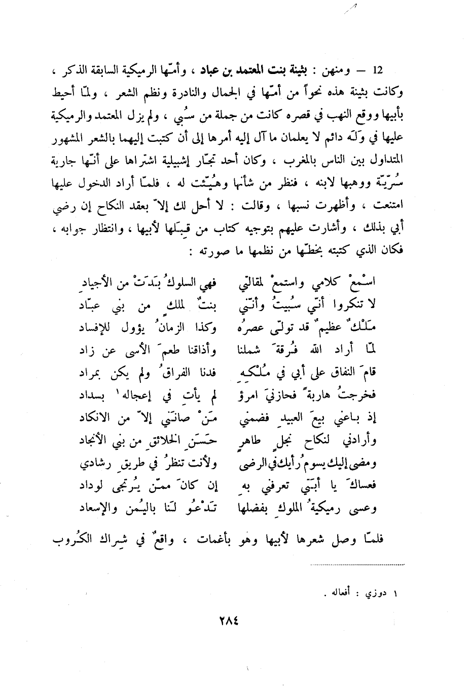 12 - ومنهن: بثينة بنت المعتمد بن عباد، وأمها الرميكية السابقة الذكر، وكانت بثينة هذه نحواً من أمها في الجمال والنادرة ونظم الشعر، ولما أحيط بأبيها ووقع النهب في قصره كانت من جملة من سبي، ولم يزل المعتمد والرميكية عليها في وله دائم لايعلمان ما آل إليه أمرها إلى أن كتبت إليهما بالشعر المشهور المتداول بين الناس بالمغرب، وكان أحد تجار إشبيلية اشتراها على أنها جارية سرية ووهبها لابنه، فنظر من شأنها وهيئت له، فلما أراد الدخول عليها امتنعت، وأظهرت نسبها، وقالت: لا أحل لك إلا بعقد نكاح إن رضي أبي بذلك الذي، وأشارت عليهم بتوجيه كتاب من قبلها لأبيها، وانتظار جوابه، فكان الذي كتبته بخطها من نظمها ما صورته: