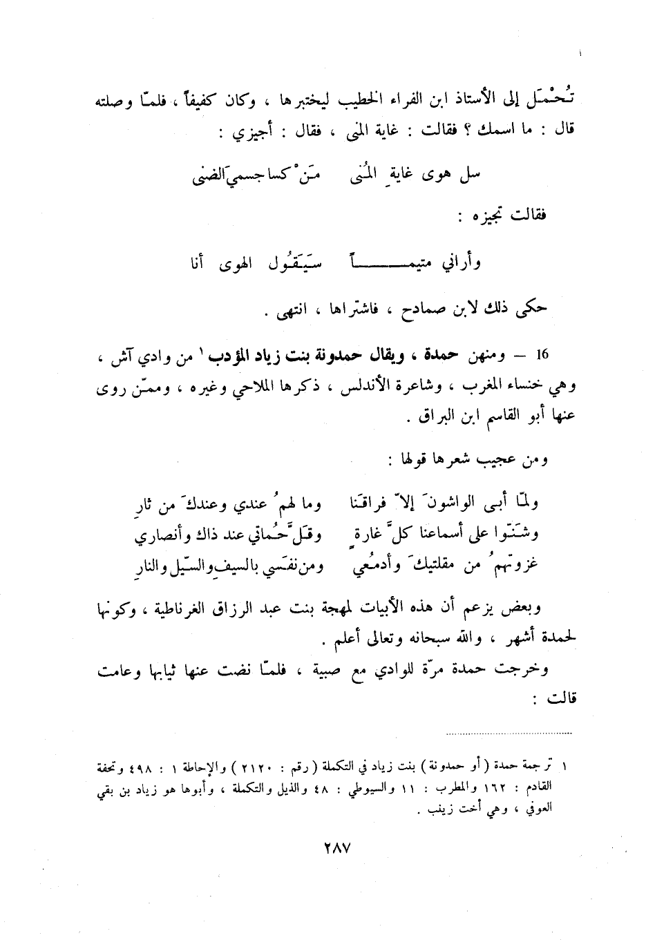 6 - ومنهن حمدة، ويقال حمدونة بنت زيادة المؤدب (1) من وادي آش، وهي خنساء المغرب، وشاعرة الأندلس، ذكرها الملاحي وغيره، وممن روى عنها أبو القاسم ابن البراق.
