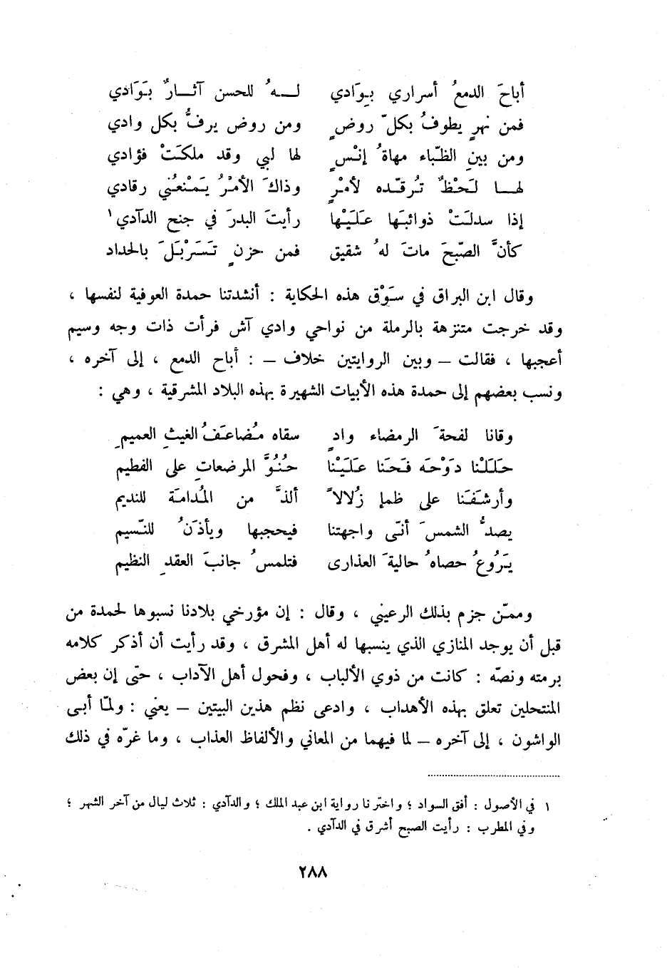 وقال ابن البراق في سوق هذه الحكاية: أنشدتنا حمدة العوفية لنفسها، وقد خرجت متنزهة بالرملة من نواحي وادي آش فرأت ذات وجه وسيم أعجبها، فقالت - وبين الروايتين خلاف - أباح الدمع، إلى آخره، ونسب بعضهم إلى حمدة هذه الأبيات الشهيرة بهذه البلاد المشرقة، وهي: