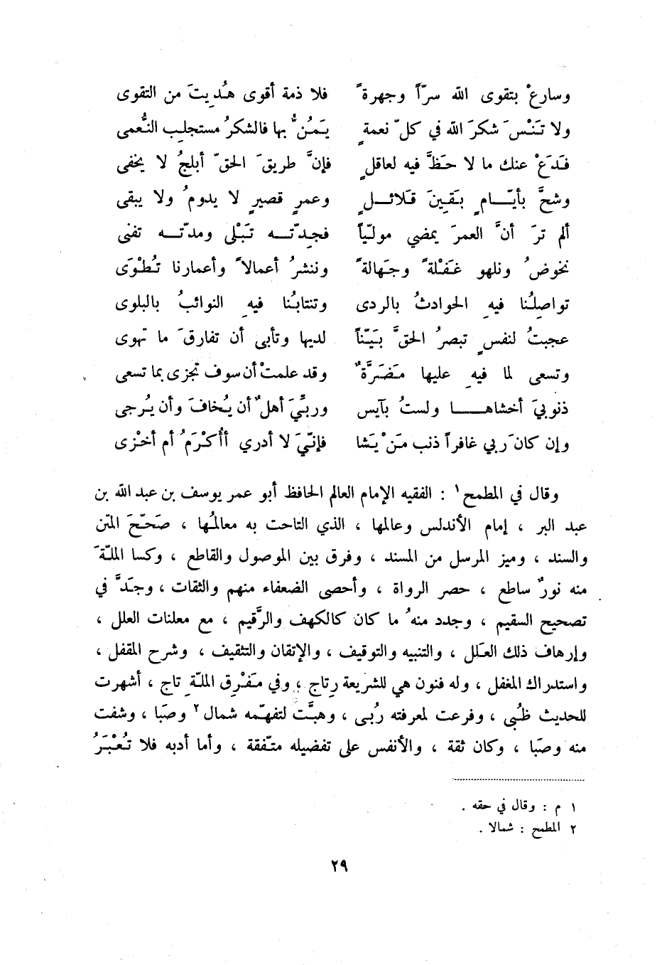 وإن كان ربي غافراً ذنب من يشا ... فإنّي لا أدري أأكرم أم أخزى وقال في المطمح (1) : الفقيه الإمام العالم الحافظ أبو عمر يوسف بن عبد الله بن عبد البر، إمام الأندلس وعالمها، الذي التاحت به معالمها، صحح المتن والسند، وميز المرسل من المسند، وفرق بين الموصول والقاطع، وكسا الملة منه نورٌ ساطع، حصر الرواة، وأحصى الضعفاء منهم والثقات، وجد في تصحيح السقيم، وجدد منه ما كان كالكهف والرقيم، مع معلنات العلل، وإرهاف ذلك العلل، والتنبيه والتوقيف، والإتقان والتثقيف، وشرح المقفل، واستدراك المغفل، وله فنون هي للشريعة رتاج، وفي مفرق الملة تاج، أشهرت للحديث ظبى، وفرعت لمعرفته ربى، وهبت لتفهمه شمال (2) وصبا، وشفت منه وصبا، وكان ثقة، والأنفس على تفضيله متفقة، وأما أدبه فلا تعبر