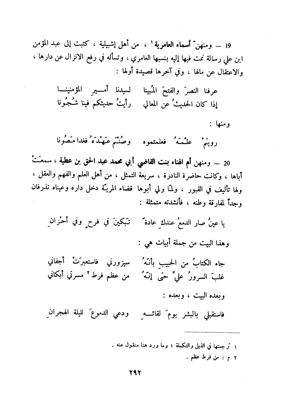 19 - ومنهن أسماء العامرية (1) ، من أهل إشبيلية، كتبت إلى عبد المؤمن ابن علي رسالة نمت فيها إليه بنسبها العامري، وتسأله في رفع الانزالعن دارها، والاعتقال عن مالها، وفي آخرها قصيدة أولها: