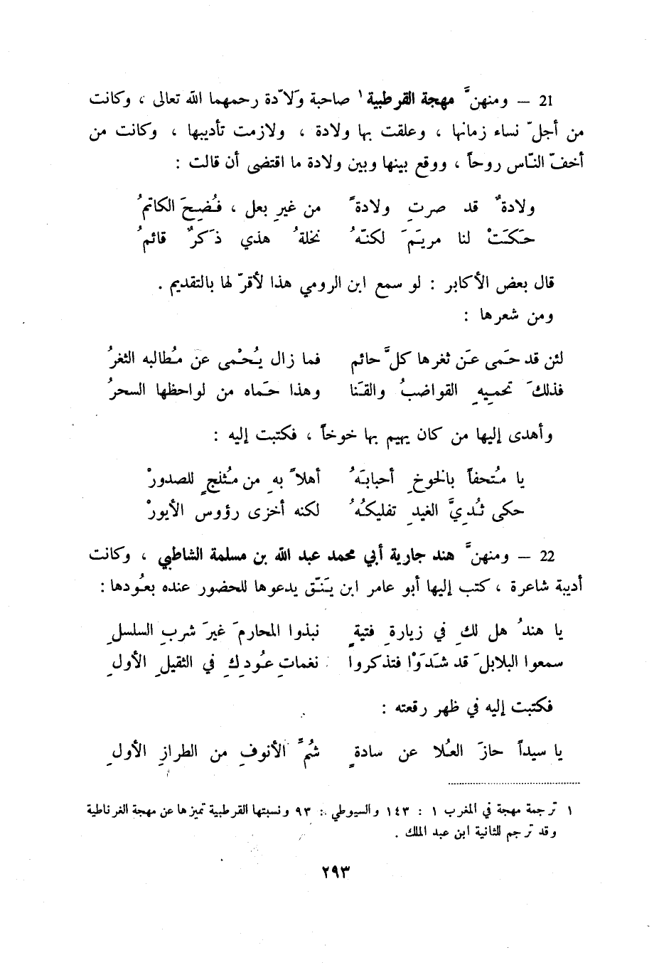 21 - ومنهن مهجة القرطبية (1) صاحبة ولادة رحمهما الله تعالى، وكانت من أجل نساء زمانها، وعلقت بها ولادة، ولازمت تأديبها، وكانت من أخف الناس روحاً، ووقع بينها وبين ولادة ما اقتضى أن قالت: