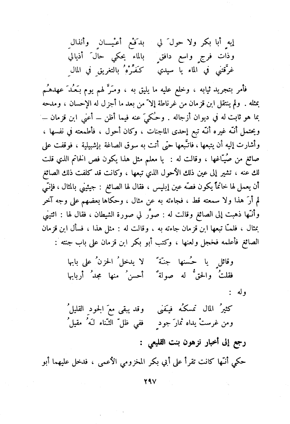 فأمر بتجريد ثيابه، وخلع عليه ما يليق به، ومر لهم يوم بعد عهدهم بمثله. ولم ينتقل ابن قزمان من غرناطة إلا من بعد ما أجزل له الإحسان، ومدحه بما هو ثابت له في ديوان أجزاله. وحكي عنه فيما أظن - أعني ابن قزمان - ويحتمل أنه غيره أنه تبع إحدى الماجنات، وكان أحول، فأطعمته في نفسها، وأشارت إليه أن يتبعها، فاتبعها حتى أتت سوق الصاغة بإشبيلية، فوقفت على صائغ من صياغها، فقالت له: يا معلم مثل هذا يكون فص الخاتم الذي قلت لك عنه، تشير إلى عين ذلك الأحول الذي تبعها، وكانت قد كلفت ذلك الصائغ أن يعمل لها خاتماً يكون فصه عين إبليس، فقال لها الصائغ: جيئيني بالمثال، فإني لم أر هذا ولا سمعته قط، فجاءته به عن مثال، وحكاها بعضهم على وجه آخر وأنها ذهبت إلى الصائغ وقالت له: صور لي صورة الشيطان، فقال لها: ائتيني بمثال، فلما تبعها ابن قزمان جاءت به، وقالت له: مثل هذا، فسأل ابن قزمان فأعلمه فخجل ولعنها، وكتب أبو بكر ابن قزمان على باب جنته: