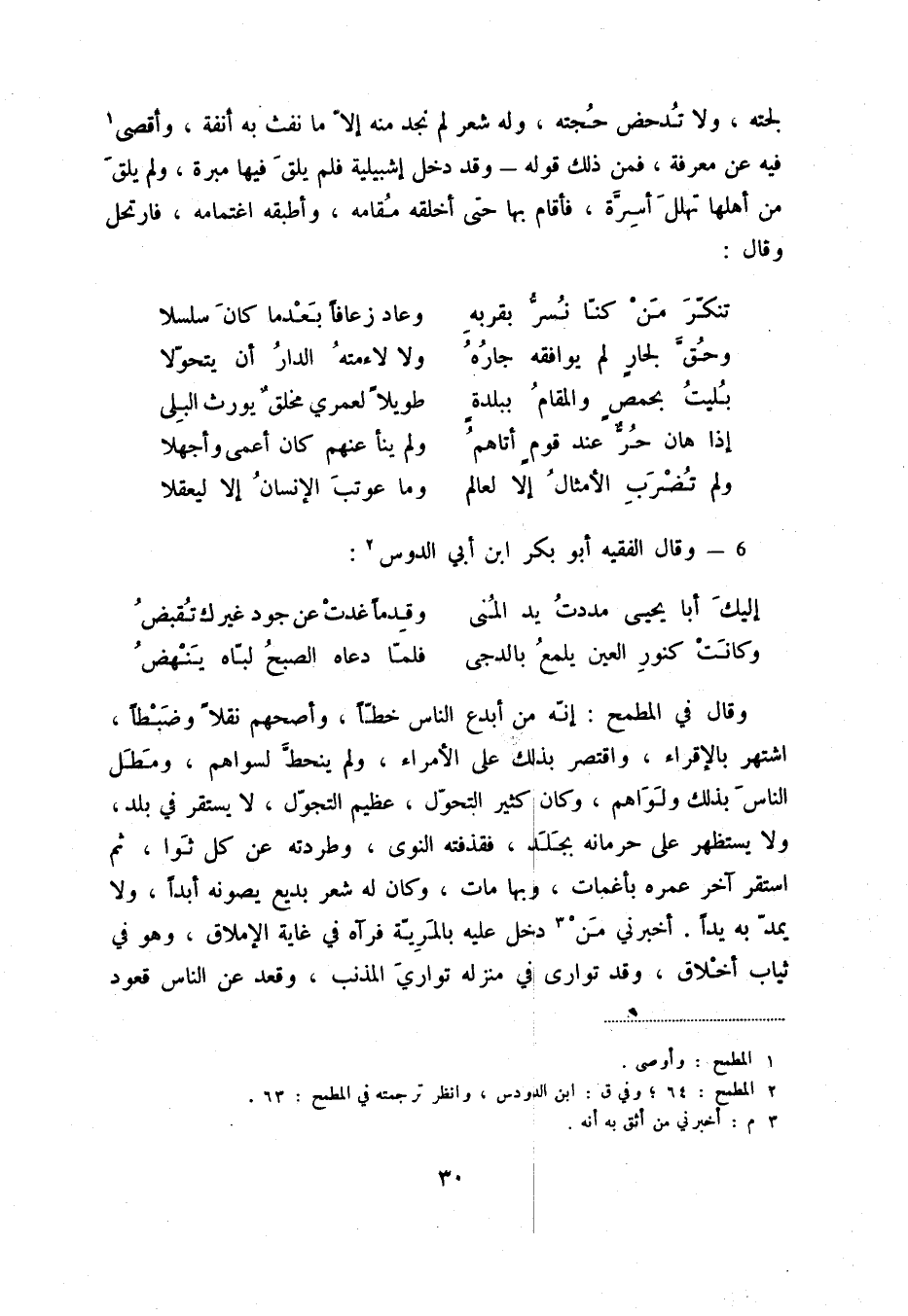 ولم تضرب الأمثال إلا لعالم ... وما عوتب الإنسان إلا ليعقلا 6 - وقال الفقيه أبو بكر ابن أبي الدوس (2) :