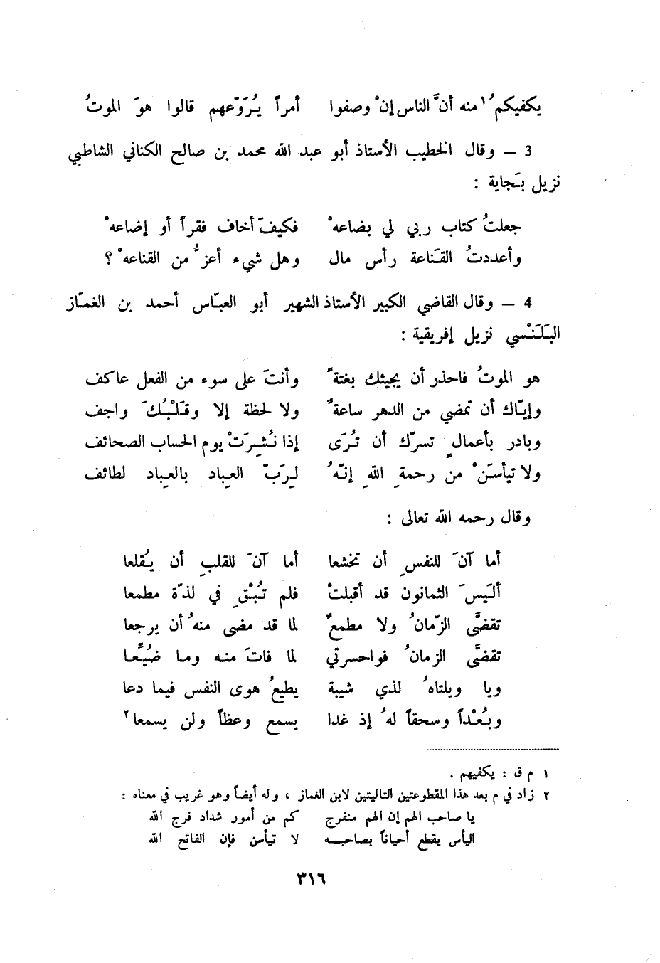 يكفيكم (1) منه أن الناس إن وصفوا ... أمراً يروعهم قالوا هو الموت 3 - وقال الخطيب الأستاذ أبو عبد الله محمد بن صالح الكناني الشاطبي نزيل بجاية: