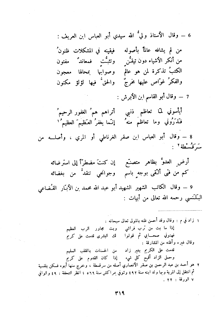 9 - وقال الكاتب الشهير الشهيد أبو عبد الله محمد بن الأبار القضاعي البلنسي رحمه الله تعالى من أبيات: