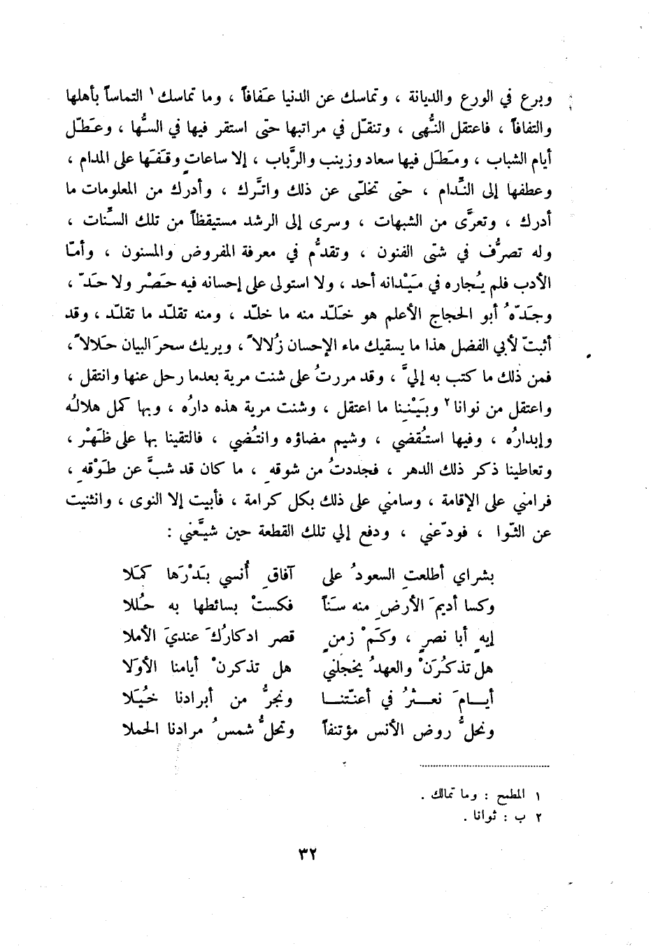وبرع في الورع والديانة، وتماسك عن الدنيا عفافاً، وما تماسك (1) التماساً بأهلها والتفافاً، فاعتقل النهى، وتنقل في مراتبها حتى استقر فيها في السها، وعطل أيام الشباب، ومطل فيها سعاد وزينب والرباب، إلا ساعات وقفها على المدام، وعطفها إلى الندام، حتى تخلى عن ذلك واترك، وأدرك من المعلومات ما أدرك، وتعرى من الشبهات، وسرى إلى الرشد مستيقظاُ من تلك السنات، وله تصرف في شتى الفنون، وتقدم في معرفة المفروض والمسنون، وأما الأدب فلم يجاره في ميدانه أحد، ولا استولى على إحسانه فيه حصر ولا حد، وجده أبو الحجاج الأعلم هو خلّد منه ما خلّد، ومنه تقلد ما تقلد، وقد أثبت لأبي الفضل هذا ما يسقيك ماء الإحسان زلالاً، ويريك سحر البيان حلالاً، فمن ذلك ما كتب به إلي، وقد مررت على شنت مرية بعدما رحل عنها وانتقل، واعتقل من نوانا (2) وبيننا ما اعتقل، وشنت مرية هذه داره، وبها كمل هلاله وإبداره، وفيها استقضي، وشيم مضاؤه وانتضي، فالتقينا بها على ظهر، وتعاطينا ذكر ذلك الدهر، فجددت من شوقه، ما كان قد شب عن طوقه، فرامني على الإقامة، وسامني على ذلك بكل كرامة، فأبيت إلا النوى وانثنيت عن الثوا، فودعني، ودفع إلي تلك القطعة حين شيعني: