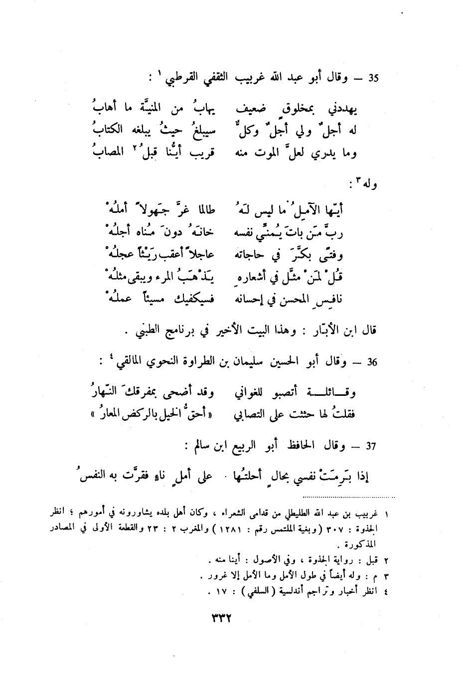 (1) غربيب بن عبد الله الطليطلي من قدامى الشعراء وكان أهل بلده يشاورونه في أمورهم؛ انظر الجذوة: 307 (وبغية الملتمس رقم: 1281) والمغرب 2: 23 والقطعة الأولى في المصادر المذكورة.