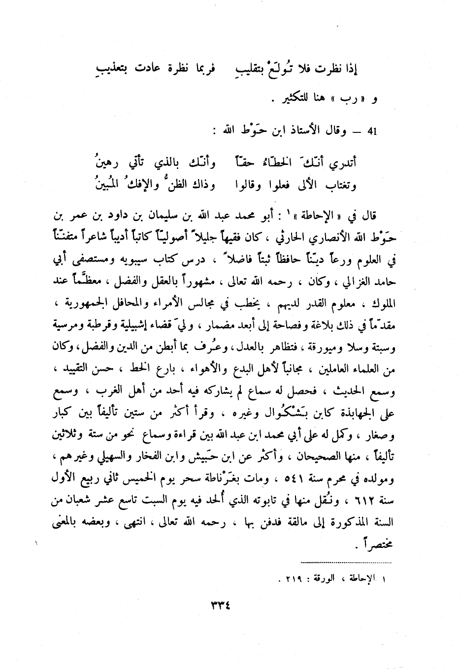 قال في " الإحاطة " (1) : أبو محمد عبد الله بن سليمان بن داود بن عمر بن حطوط الله الأنصاري الحارثي، كان فقيهاً جليلاً أصولياً كاتباً أديباً شاعراً متفنناً في العلوم ورعاً ديناً حافظاً ثبتاً فاضلاً، درس كتاب سيبويه ومستصفى أبي حامد الغزالي، وكان، رحمه الله تعالى، مشهوراً بالعقل والفضل، معظماً عند الملوك، معلوم القدر لديهم، يخطب في مجالس الأمراء والمحافل الجمهورية، مقدماً في ذلك بلاغة وفصاحة إلى أبعد مضمار، ولي قضاء إشبيلية وقرطبة ومرسية وسبتة وسلا وميورقة، فتظاهر بالعدل، وعرف بما أبطن من الدين والفضل، وكان من العلماء العاملين، مجانباً لأهل البدع والأهواء، بارع الخط، حسن التقييد، وسمع الحديث، فحصل له سماع لم يشاركه فيه أحد من أهل الغرب، وسمع على الجهابذة كابن بشكوال ةغيره، وقرأ أكثر من ستين تأليفاً بين كبار وصغار، منها الصحيحان، وأكثر عن ابن حبيش وابن الفخار والسهيلي وغيرهم، ومولده في محرم سنة 541، ومات بغرناطة سحر يوم الخميس ثاني ربيع الأول سنة612، ونقل منها في تابوته الذي ألحد فيه يوم السبت تاسع عشر شعبان من السنة المذكورة إلى مالقة فدفن بها، رحمه الله تعالى، انتهى، وبعضه بالمعنى مختصراً.