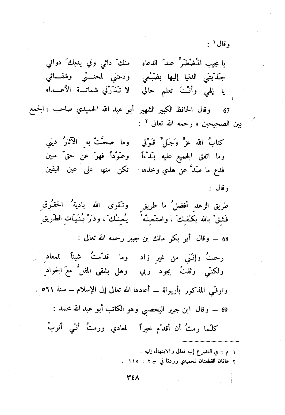 67 - وقال الحافظ الكبير الشهير أبو عبد الله الحميدي صاحب الجمع بين الصحيحين رحمه الله تعالى (1) :