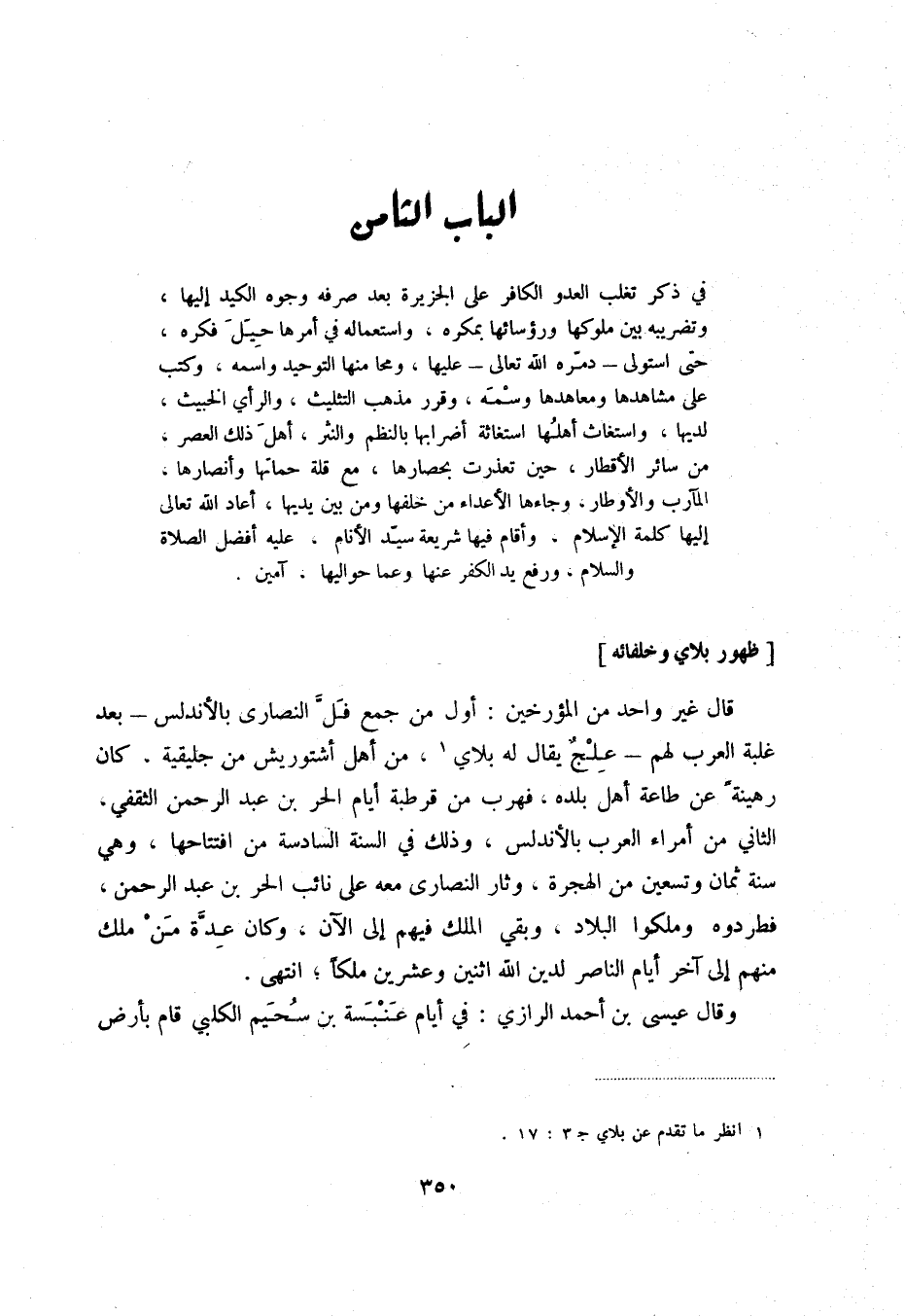قال غير واحد من المؤلفين: أول من جمع فل النصارى بالأندلس - بعد غلبة العرب لهم - علج يقال له بلاي (1) ، من أهل أشتوريش من جليقية، كان رهينة عن طاعة أهل بلده، فهرب من قرطبة أيام الحر بن عبد الرحمن الثقفي، الثاني من أمراء العرب بالأندلس، وذلك في السنة السادسة من افتتاحها، وهي سنة ثمان وتسعين من الهجرة، وثار النصارى معه على نائب الحر بن عبد الرحمن، فطردوه وملكوا البلاد، وبقي الملك فيهم إلى الآنن وكان عدة من ملك منهم إلى آخر أيام الناصر لدين الله اثنين وعشرين ملكاً، انتهى.