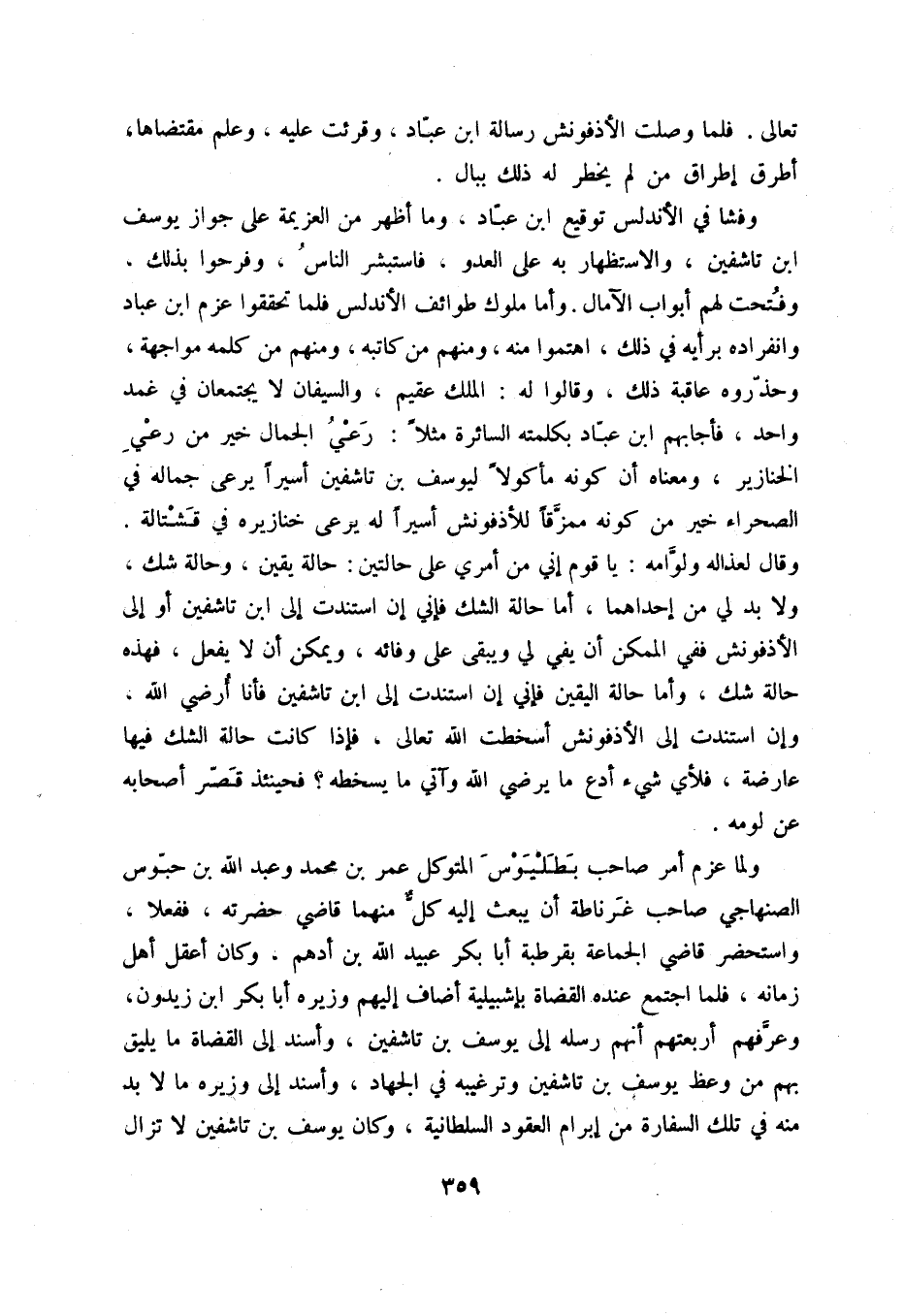تعالى. فلما وصلت الأذفونش رسالة بن عباد، وقرئت عليه، وعلم مقتضاها، أطرق إطراق من لم يخطر له ذلك ببال.