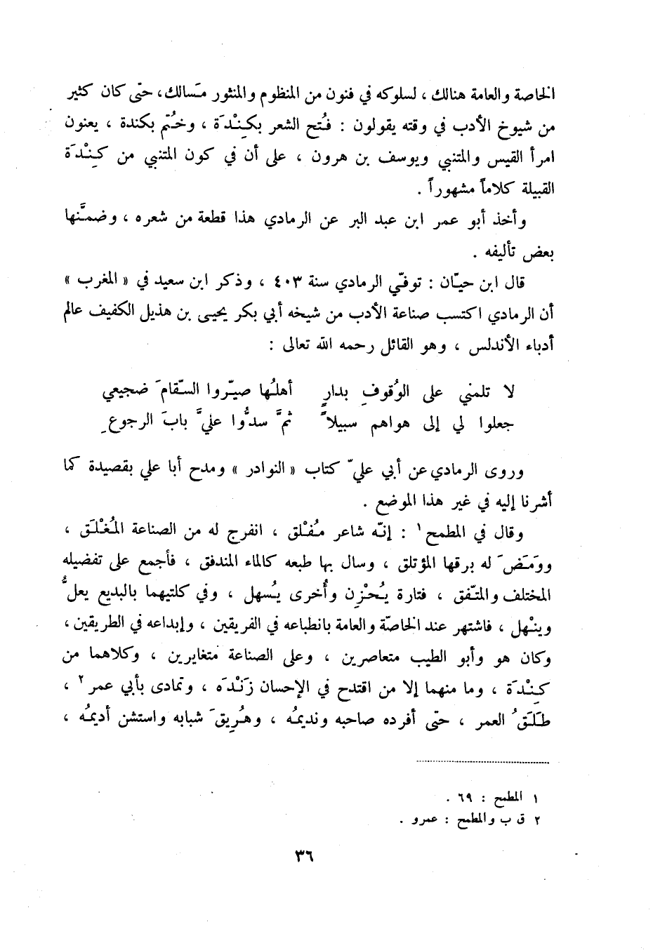 وقال في المطمح (1) : إنه شاعر مفلق، انفرج له من الصناعة المغلق، وومض له برقها المؤتلق، وسال بها طبعه كالماء المندفق، فأجمع على تفضيله المختلف والمتفق، فتارة يحزن وأخرى يسهل، وفي كلتيهما بالبديع يعل وينهل، فاشتهر عند الخاصة والعامة بانطباعه في الفريقين، وإبداعه في الطريقين، وكان هو وأبو الطيب متعاصرين، وعلى الصناعة متغايرين، وكلاهما من كندة، وما منهما إلا من اقتدح في الإحسان زنده وتمادى بأبي عمر (2) ، طلق العمرحتى أفرده صاحبه ونديمه، وهريق شبابه واستشن أديمه،