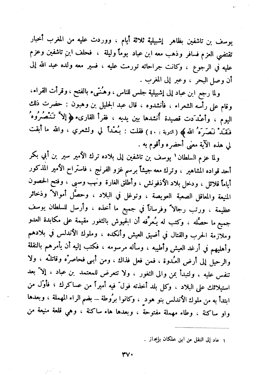 ولما رجع ابن عباد إلى إشبيلية جلس للناس، وهنئ بالفتح، وقرأت القراء، وقام على رأسه الشعراء، فأنشدوه، قال عبد الجليل بن وهبون: حضرت ذلك اليوم، وأعددت قصيدة أنشدها بين يديه، فقرأ القارئ " إلا تنصروه فقد نصره الله " فقلت: بعداً لي ولشعري، والله ما أبقت لي هذه الآية معنى أحضره وأقوم به.