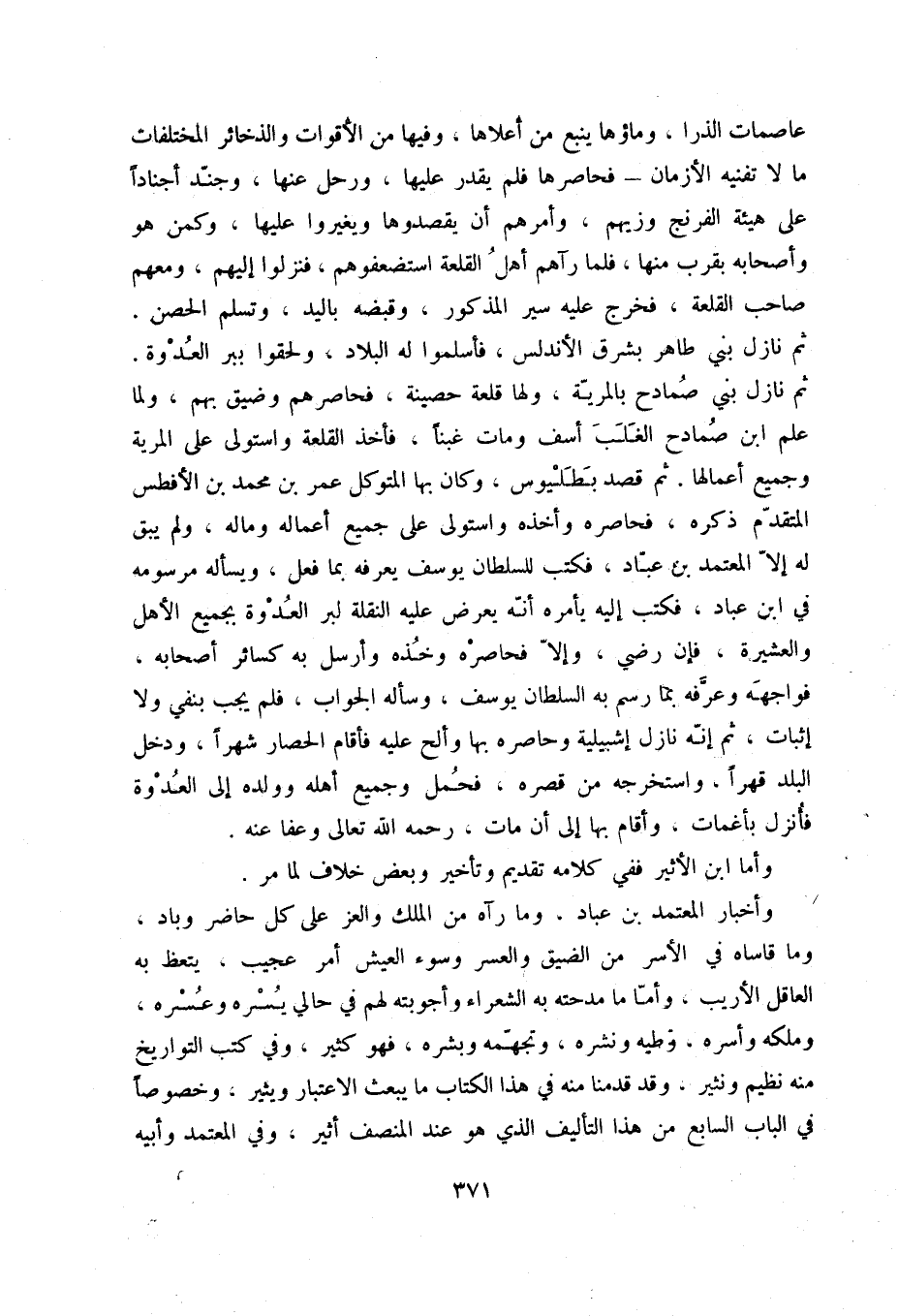 وأخبار المعتمد بن عباد، وما رآه من الملك والعز على كل حاضر وباد، وما قاساه في الأسر من الضيق والعسر وسوء العيش أمر عجيب، يتعظ به العاقل الأريب، وأما ما مدحته به الشعراء وأجوبته لهم في حالي يسره وعسرهن وملكه وأسره، وطيه ونشره، وتجهمه وبشره، فهو كثير، وفي كتب التواريخ منه نظم ونثير، وقد قدمنا منه في هذا الكتاب ما يبعث الاعتبار ويثير، وخصوصاً في الباب السابع من هذا التأليف الذي هو عند المنصف أثير، وفي المعتمد وأبيه