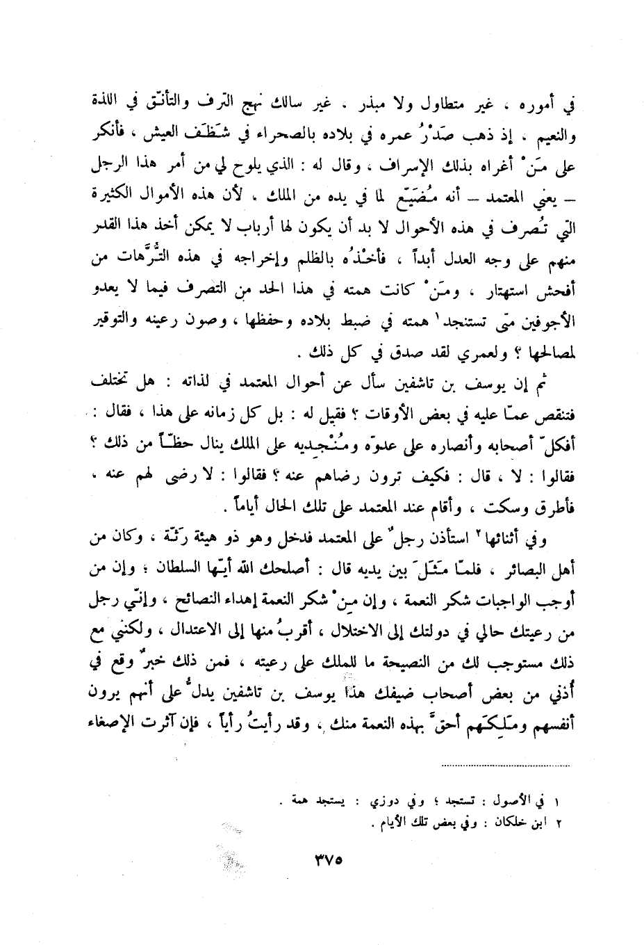 في أموره، غير متطاول ولا مبذر، غير سالك نهج الترف والتأنق في اللذة والنعيم، إذ ذهب صدر عمره في بلاده بالصحراء في شظف العيش، فأنكر على من أغراه بذلك الإسراف، وقال له: الذي يلوح لي من أمر هذا الرجل - يعني المعتمد - أنه مضيع لما في يده من الملك، لأن هذه الأموال الكثيرة التي تصرف في هذه الأحوال لا بد أن يكون لها أرباب لا يمكن أخذ هذا القدر منهم على وجه العدل أبداً، فأخذه بالظلم وإخراجه في هذه الترهات من أفحش استهتار، ومن كانت همته في هذا الحد من التصرف فيما لا يعدو الأجوفين متى تستنجد (1) همته في ضبط بلاده وحفظها، وصون رعينه والتوقير لمصالحها ولعمري لقد صدق في كل ذلك.