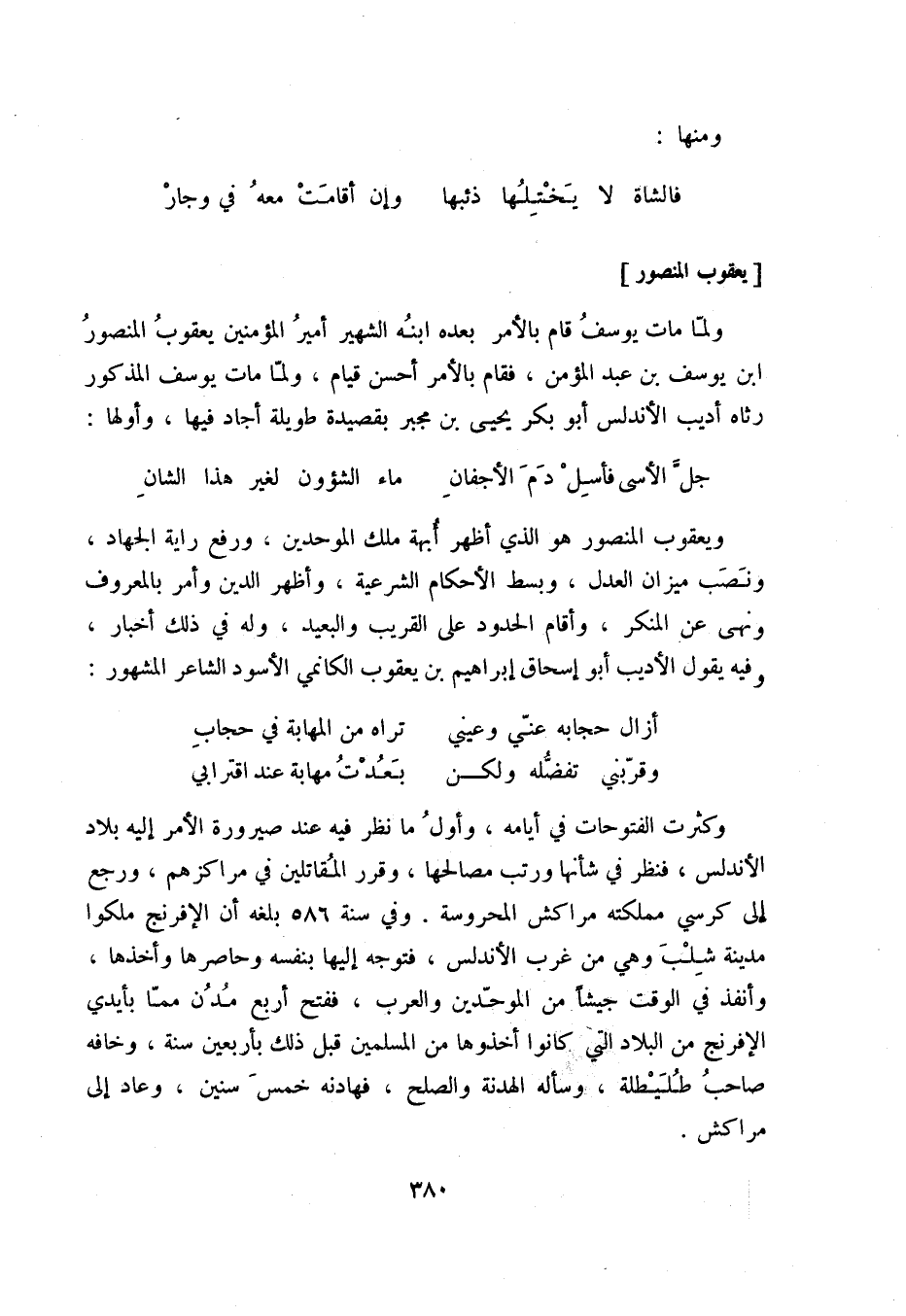 ولما مات يوسف قام بالأمر بعده ابنه الشهير أمير المؤمنين يعقوب المنصور بن يوسف بن عبد المؤمن، فقام بالأمر أحسن قيام، ولما مات يوسف المذكور رثاه أديب الأندلس أبو بكر يحيى بن مجبر بقصيدة طويلة أجاد فيها، وأولها: