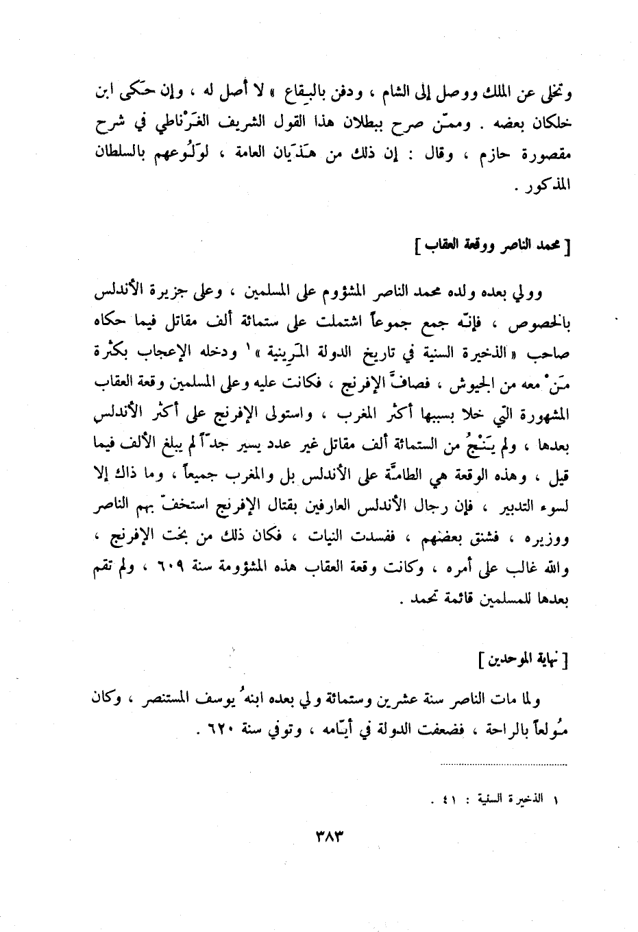 وولي بعده ولده محمد الناصر المشؤوم على المسلمين، وعلى جزيرة الأندلس بالخصوص، فإنه جمع جمعاً اشتملت على ستمائة ألف مقاتل فيما حكاه صاحب " الذخيرة السنية في تاريخ الدولة المرينية " (1) ودخله الإعجاب بكثرة من معه من الجيوش، فصاف الإفرنج، فكانت عليه وعلى المسلمين وقعة العقاب المشهورة التي خلا بسببها أكثر المغرب، واستولى الإفرنج على أكثر الأندلس بعدها، ولم ينج من الستمائة ألف مقاتل غير عدد يسير جداً لم يبلغ الألف فيما قيل، وهذه الوقعة هي الطامة على الأندلس بل والمغرب جميعاً، وما ذاك إلا لسوء التدبير، فإن رجال الأندلس العارفين بقتال الإفرنج استخف بهم الناصر ووزيره، فشنق بعضهم، ففسدت النيات، فكان ذلك من بخت الإفرنج، والله غالب على أمره، وكانت وقعة العقاب هذه المشؤومة سنة 609، ولم تقم بعدها للمسلمين قائمة تحمد.