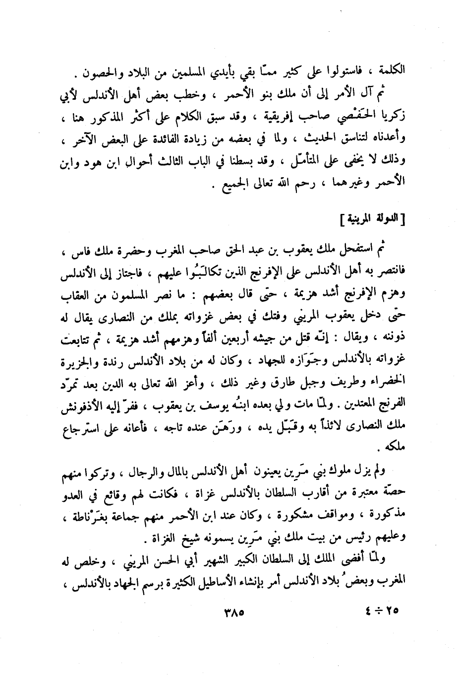 ثم استفحل ملك يعقوب بن عبد الحق صاحب المغرب وحضرة ملك فاس، فانتصر به الأندلس على الإفرنج الذين تكالبوا عليهم، فاجتاز إلى الأندلس وهزم الإفرنج أشد هزيمة، حتى قال بعضهم: ما نصر المسلمون من العقاب حتى دخل يعقوب المريني وفتك في بعض غزواته بملك من النصارى يقال له ذوننه، ويقال: إنه قتل من جيشه أربعين ألفاً وهزمهم أشد هزيمة، ثم تتابعت غزواته بالأندلس وجوازه للجهاد، وكان له من بلاد الأندلس رندة والجزيرة الخضراء وطريف وجبل طارق وغير ذلك، وأعز الله تعالى به الدين بعد تمرد الفرنج المعتدين. ولما مات ولي بعده ابنه يوسف بن يعقوب، ففر إليه الأذفونش ملك النصارى لائذاً به وقبل يده، ورهن عند تاجه، فأعانه على استرجاع ملكه.