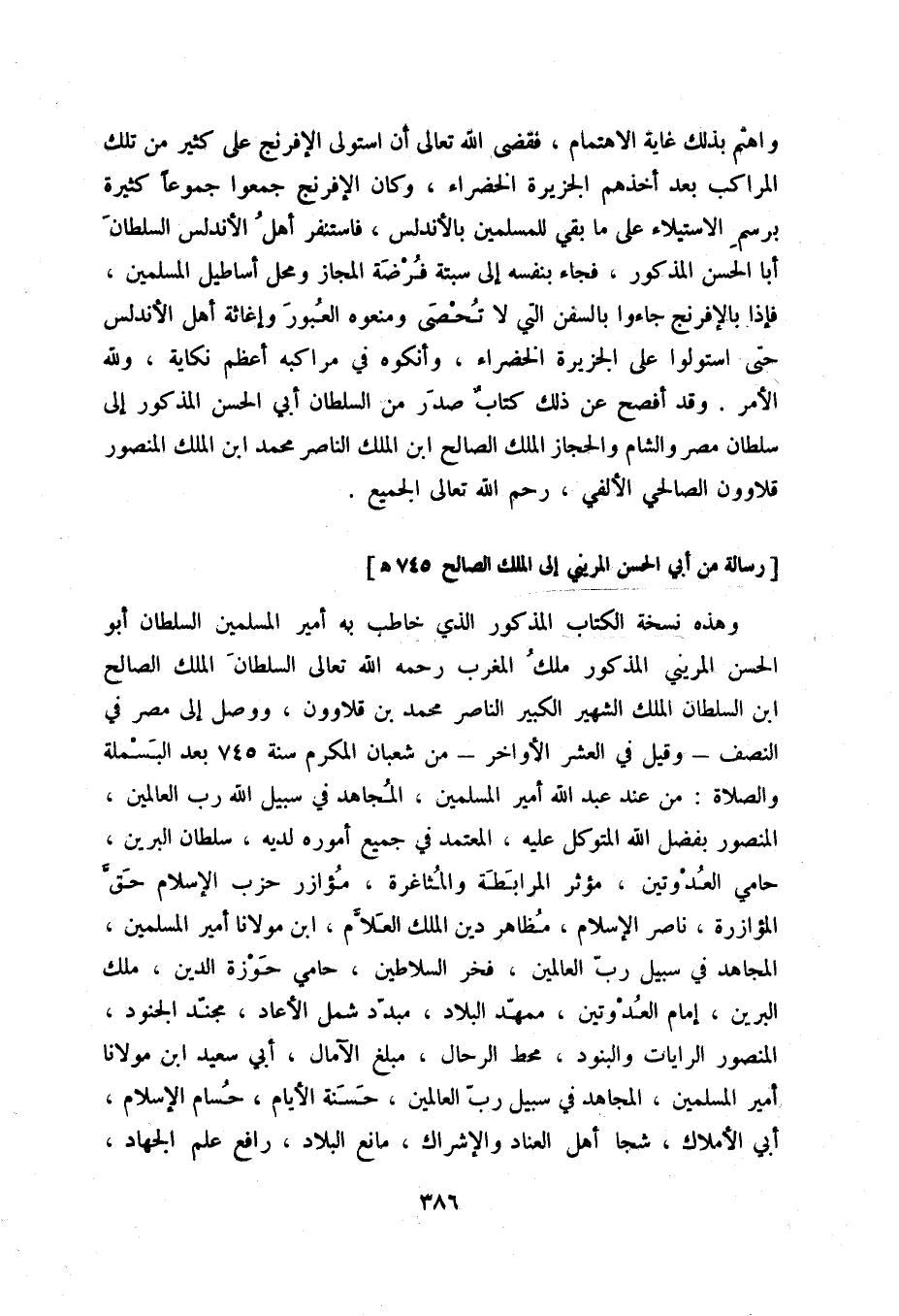 وهذه نسخة الكتاب المذكور الذي خاطب به أمير المسمين السلطان أبو الحسن المريني المذكور ملك المغرب رحمه الله تعالى السلطان الملك الصالح ابن السلطان الملك الشهير الكبير الناصر محمد بن قلاوون، ووصل إلى مصر في النصف - وقيل في العشر الأواخر - من شعبان المكرم سنة 745 بعد البسملة والصلاة: من عبد الله أمير المسلمين، المجاهد في سبيل الله رب العالمين، المنصور بفضل الله المتوكل عليه، المعتمد في جميع أموره لديه، سلطان البرين، حامي العدوتين، مؤثر المرابطة والثاغرة، مؤازر حزب الإسلام حق المؤازرة، ناصر الإسلام، مظاهر دين الملك العلام، ابن مولانا أمير المسلمين، المجاهد في سبيل رب العالمين، فخر السلاطين، حامي حوزة الدين، ملك البرين، إمام العدوتين، ممهد البلاد، مبدد شمل الأعاد، مجند الجنود، المنصور الرايات والبنود، محط الرحال، مبلغ الآمال، أبي سعيد ابن مولانا أمير المسلمين، المجاهد في سبيل رب العالمين، حسنة الأيام، حسام الإسلام، أبي الأملاك، شجا أهل العناد والإشراك، مانع البلاد، رافع علم الجهاد