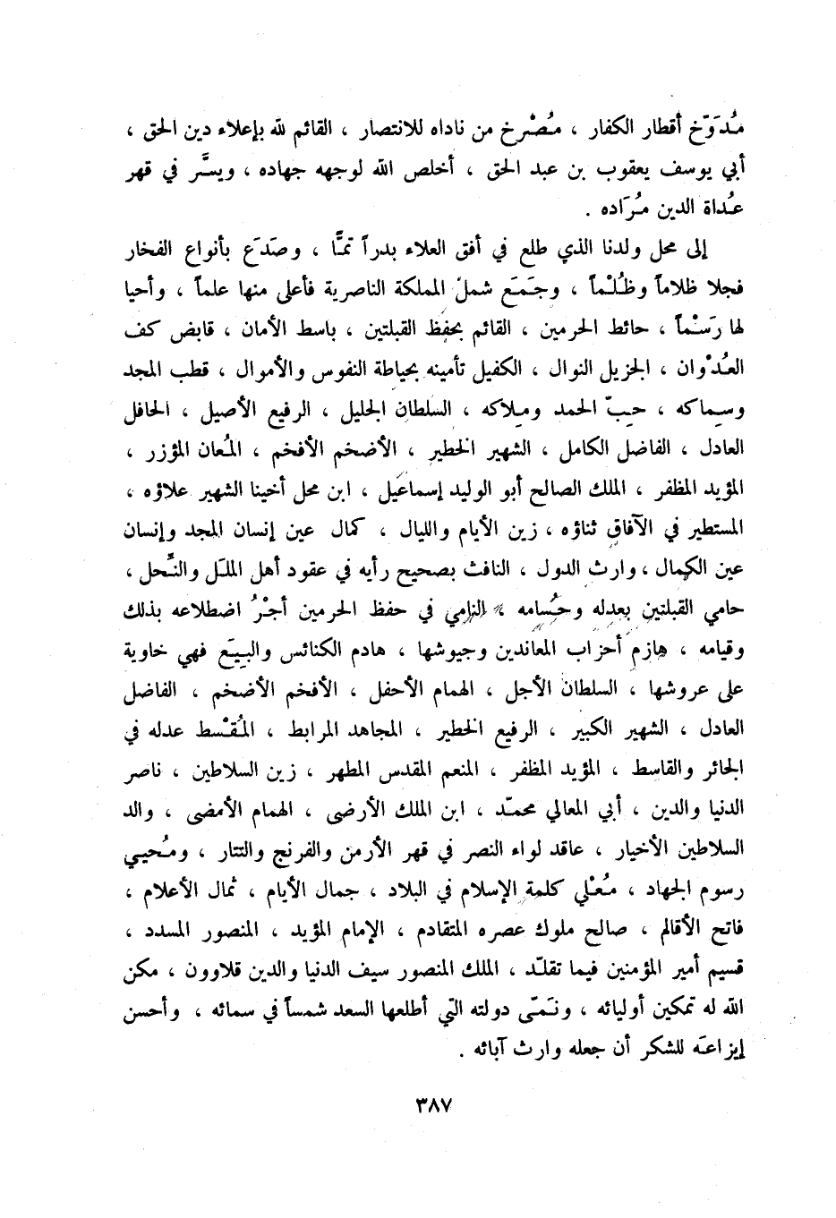 إلى محل ولدنا الذي طلع في أفق العلاء بدراً تماً، وصدع بأنواع الفخار فجلا ظلاماً وظلماً، وجمع شمل المملكة الناصرية فأعلى منها علماً، وأحيا لها رسماً، حائط الحرمين، القائم بحفظ القبلتين، باسط الأمان، قابض كف العدوان، الجزيل النوال، الكفيل تأمينه بحياطة النفوس والأموال، قطب المجد وسماكه، حب الحمد وملاكه، السلطان الجليل، الرفيع الأصيل، الحافل العادل، الفاضل الكامل، الشهير الخطير، الأضخم الأفخم، المعان المؤزر، المؤيد المظفر، الملك الصالح أبو الوليد إسماعيل، ابن محل أخينا الشهير علاؤه، المستطير في الآفاق ثناؤه، زين الأيام والليال، كمال عين إنسان المجد وإنسان عين الكمال، وارث الدول، النافث بصحيح رأيه في عقود أهل الملل والنحل، حامي القبلتين بعدله وحسامه، النامي في حفظ الحرمين أجر اضطلاعه بذلك وقيامه، هازم أحزاب المعاندين وجيوشها، هادم الكنائس والبيع فهي خاوية على عروشها، السلطان الأجل، الهمام الأحفل، الأفخم الأضخم، الفاضل العادل، الشهير الكبير، الرفيع الخطير، المجاهد المرابط، المقسط عدله في الجائز والقاسط، والمؤيد المظفر، المنعم المقدس المطهر، زين السلاطين، ناصر الدنيا والدين، أبي المعالي محمد، ابن الملك الأرضي، الهمام الأمضى، والد السلاطين الأخيار، عاقد لواء النصر في قهر الأرمن والفرنج والتتار، ومحيي رسوم الجهاد، معلي كلمة الإسلام في البلاد، جمال الأيام، ثمال الأعلام، فاتح الأقالم، صالح ملوك عصره المتقادم، الإمام المؤيد، المنصور المسدد، قسيم أمير المؤمنين فيما تقلد، الملك المنصور سيف الدنيا والدين قلاوون، مكن الله له تمكين أوليائه، ونمى دولته التي أطعلها السعد شمساً في سمائه، وأحسن إيزاعه للشكر أن جعله وارث آبائه.
