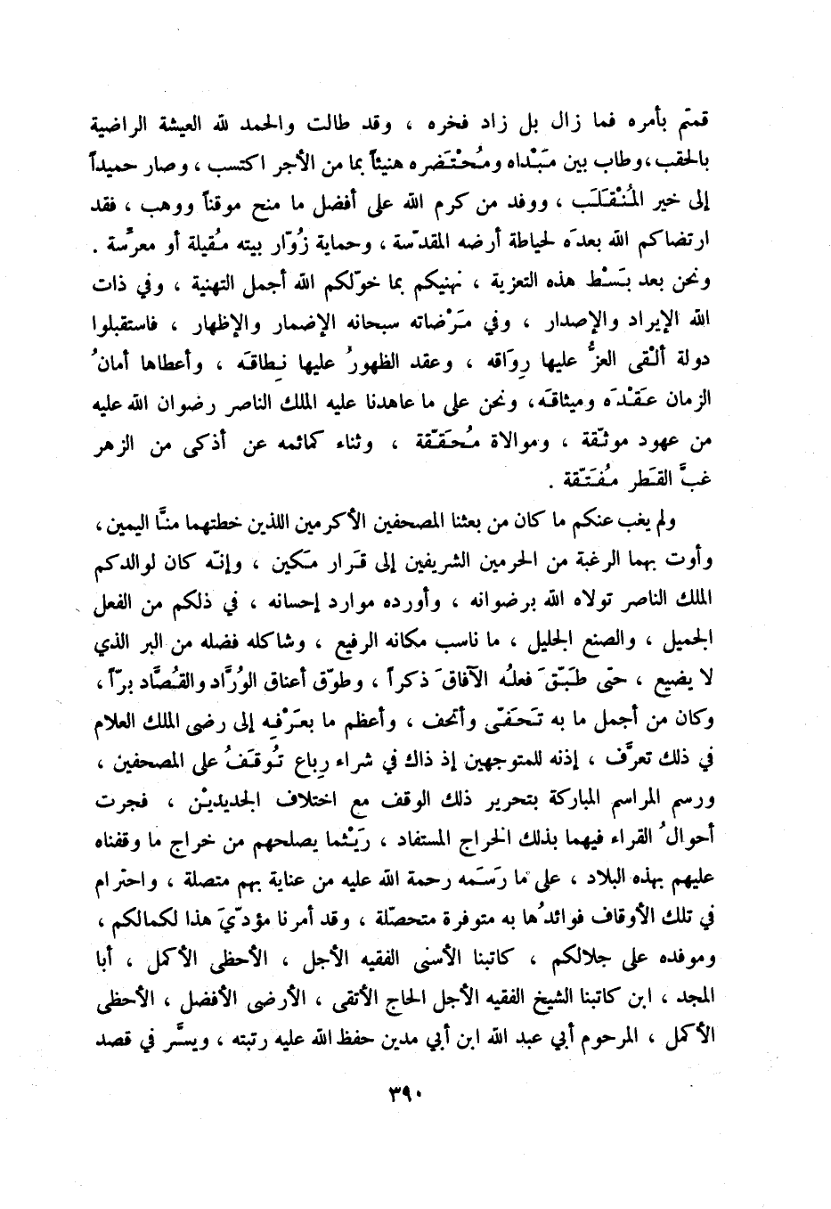 ولم يغب عنكم ما كان من بعثنا المصحفين الأكرمين اللذين خطتهما منا اليمين، وأوت بهما الرغبة من الحرمين الشريفين إلى قرار مكين، وإنه كان لوالدكم الملك الناصر تولاه الله برضوانه، وأورده موارد إحسانه، في ذلكم من الفعل الجميل، والصنع الجليل، ما ناسب مكانه الرفيع، وشاكله فضله من البر الذي لايضيع، حتى طبق فعله الآفاق ذكراً، وطوق أعناق الوراد والقصاد براً، وكان من أجمل ما به تحفى وأتحف، وأعظم ما بعرفه إلى رضى الملك العلام في ذلك تعرف، إذنه للمتوجهين إذ ذاك الوقف مع اختلاف الجديدين، فجرت أحوال القراء فيهما بذلك الخراج المستقاد، ريثما يصلحهم من خراج ما وقفناه عليهم بهذه البلاد، على ما رسمه رحمة الله عليه من عناية بهم متصلة، واحترام في تلك الأوقاف فوائدها به متوفرة متحصلة، وقد أمرنا مؤدي هذا لكمالكم، وموفده على جلالكم، كاتبنا الأسنى الفقيه الأجل، الأحظى الأكمل، أبا المجد، ابن كاتبنا الشيخ الفقيه الأجل الحاج الأتقى، الأضرى الأفضل، الأحظى الاأكمل، المرحوم أبي عبد الله ابن أبي ندين حفظ الله عليه رتبته، ويسر في قصد