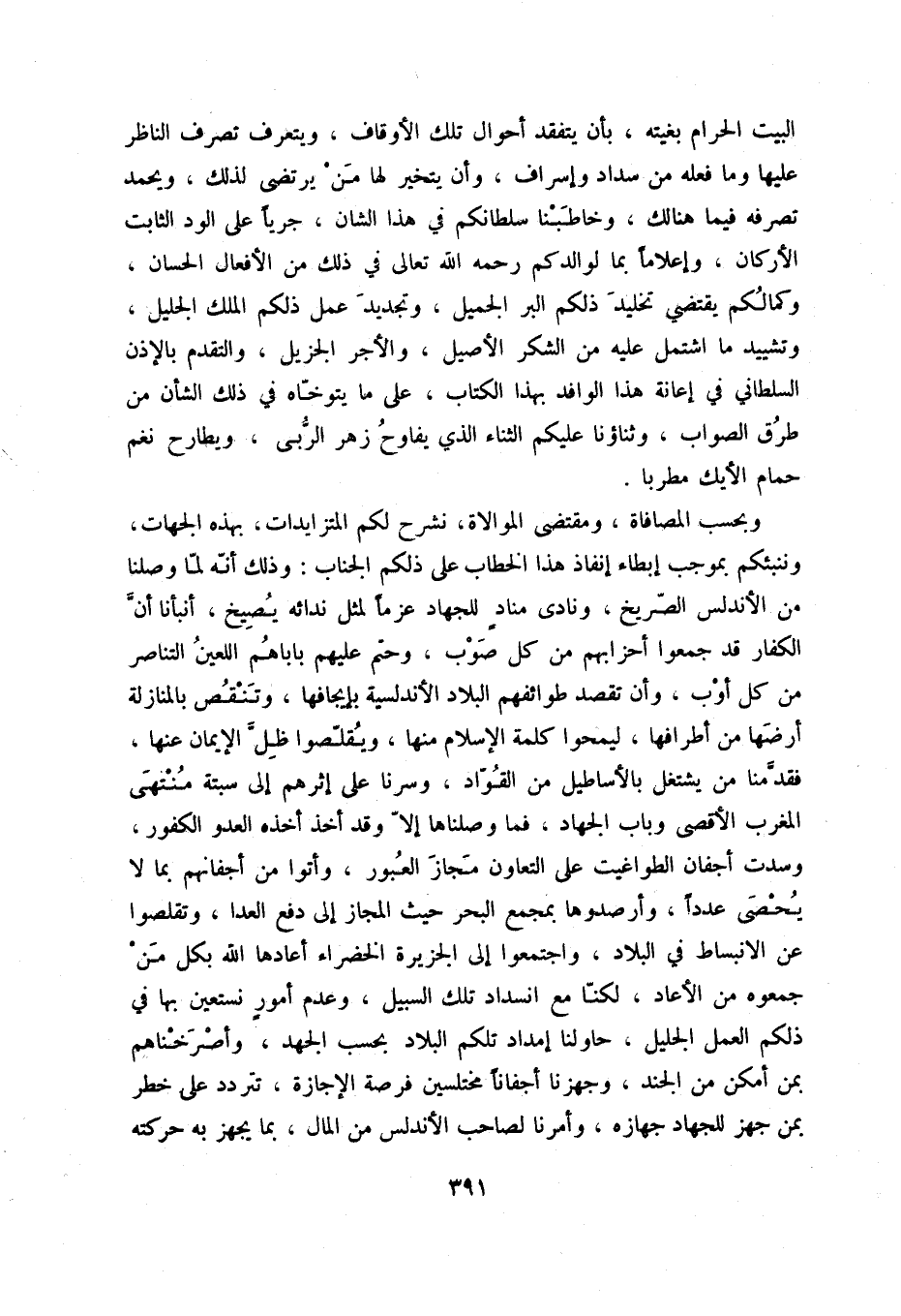 البيت الحرام بغيته، بأن يتفقد أحوال تلك الأوقاف، ويتعرف تصرف الناظر عليها وما فعله من سداد وإسراف، وأن يتخير لها من يرضى لذلك، ويحمد تصرفه فيما هنالك، وخاطبنا سلطانكم في هذا الشأن، جرياً على الود الثابت الأركان، وإعلاماً بما لوالدكم رحمه الله تعالى في ذلك من الأفعال الحسان، وكمالكم يقضي تخليد ذلكم البر الجميل، وتجديد عمل ذلكم الملك الجليل، وتشييد ما اشتمل عليه من الشكر الأصيل، والأجر الجزيل، والتقدم بالإذن السلطاني في إعانة هذا الوافد بهذا الكتاب، على ما يتوخاه في ذلك الشأن من طرق الصواب، وثنائنا عليكم الثناء الذي يفاوح زهر الربى، ويطارح نغم حمام الأيك مطربا.