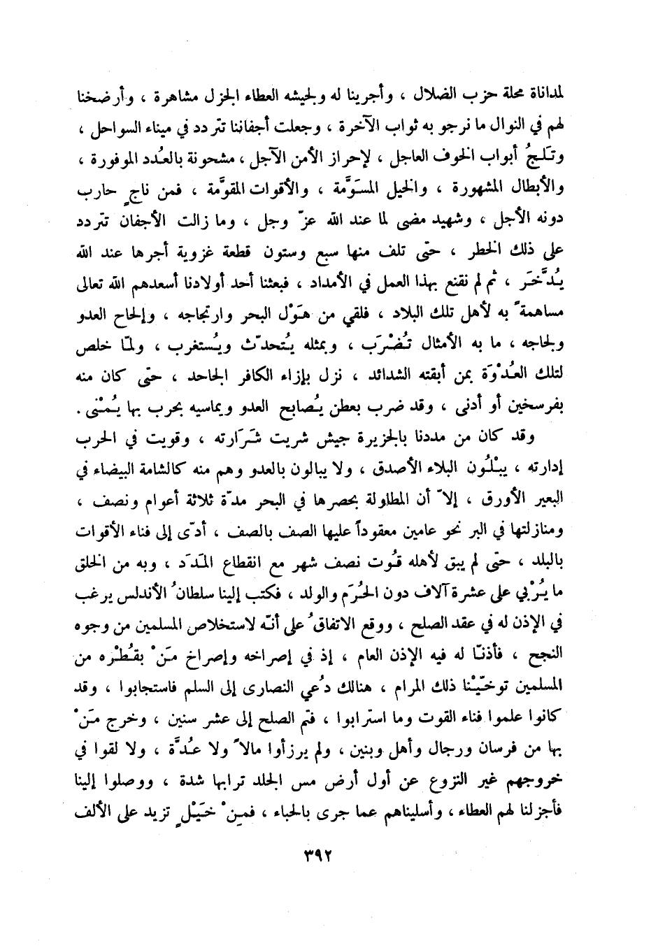 لمداناة محلة حزب الضلال، وأجرينا له ولجيشه العطاء الجزل مشاهرة، وأرضخنا لهم في النوال ما نرجو به ثواب الآخرة، وجعلت أجفاننا تتردد في ميناء السواحل، وتلج أبواب الخوف العاجل، لإحراز الأمن الآجل، مشحونة بالعدد الموفورة، والأبطال المشهورة، والخيل المسومة، والأقوات المقومة، فمن ناج حارب دونه الأجل وشهيد مضى لما عند الله عز وجل، وما زالت الأجفان تتردد على ذلك الخطر، حتى تلف منها سبع وستون قطعة غزوية أجرها عند الله يدخر، ثم لم نقنع بهذا العمل في الامداد، فبعثنا أحد أولادنا أسعدهم الله تعالى مساهمة به لأهل تلك البلاد، فلقي من هول البحر وارتجاجه، وإلحاح العدو ولجاجه، ما به الأمثال تضرب، وبمثله يتحدث ويستغرب، ولما خلص بتلك العدوة بمن أبقته الشدائد، نزل بإزاء الكافر الجاحد، حتى كان منه بفرسخن أو أدنى، وقد ضرب بعطن يصابح العدو ويماسيه بحرب بها يمنى.