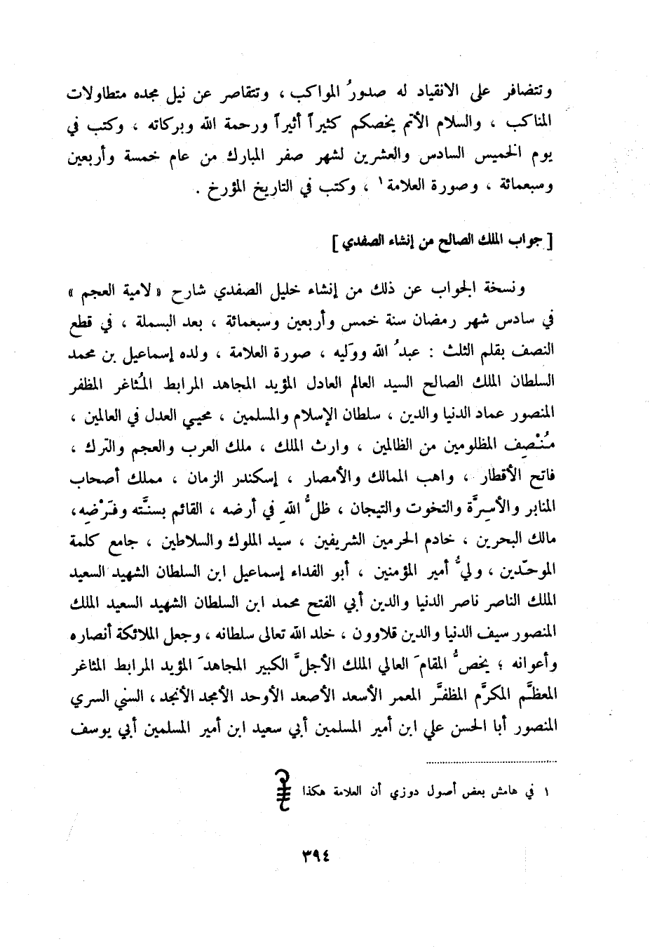 ونسخة الجواب عن ذلك من إنشاء خليل الصفدي شارح لامية العجم في سادس شهر رمضان سنة خمس وأربعين وسبعمائة، بعد البسملة، في قطع النصف بقلم الثل؛ عبد الله ووليه، صورة العلامة، ولده اسماعيل بن محمد السلطان الملك الصالح السيد العالم العادل المؤيد المجاهد المرابط المثاغر المظفر المنصور عماد الدنيا والدين، سلطان الإسلام والمسلمين، محيي العدل في العالمين، منصف المظلومين من الظالمين، وارث الملك، ملك العرب والعجم والترك، فاتح الأقطار، واهب الممالك والأمصار، إسكندر الزمان، مملك أصحاب المنابر والأسرة والتخوت والتيجان، ظل الله في أرضه، القائم بسنته وفرضه، مالك البحرين، خادم الحرمين الشريفين، سيد الملوك والسلاطين، جامع كلمة الموحدين، ولي أمير المؤمنين، أبو الفداء إسماعيل ابن السلطان الشهيد السعيد الملك الناصر ناصر الدنيا والدين أبي الفتح محمد ابن السلطان الشهيد السعيد الملك المنصور سيف الدنيا والدين قلاوون، خلد الله تعالى سلطانه، وجعل الملائكة أنصاره وأعوانه، يخص المقام العالي الملك الأجل الكبير المجاهد المؤيد المرابط المثاغر المعظم المكرم المظفر المعمر الأسعد الأصعد الأوحد الأمجد الأنجد، السني السري المنصور أبا الحسن علي ابن أمير المسلمين أبي سعيد ابن أمير المسلمين أبي يوسف