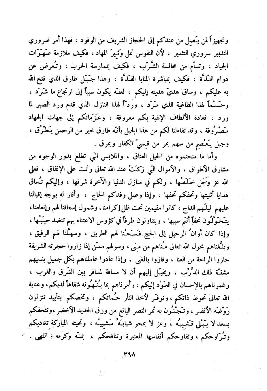 وأما ما منحتموه من الخيل العتاق، والملابس التي تطلع بدور الوجوه مشارق الأطواق، والأموال زكت عند الله تعالى ونمت على الإنفاق، فعلى الله عز وجل خلفها، ولكم في منازل الدنيا والآخرة شرفها، وإليكم تساق هدايا أثنيتها وتحفكم تحفها، وإذا وصل وفدكم الحاج، وأنار له بوجه إقبالنا عليهم ليلهم الداج، كانوا مقيمين تحت ظل إكرامنا، وشمول إسعافنا لهم وإنعامنا، يتخولون تحفاً أنتم سببها، ويتناولون طرفاً في كؤوس الاعتناء بهم تنضد حببها، وإذا كان أوان الرحيل إلى الحج فسحنا لهم الطريق، وسهلنا لهم الرفيق، وبلغناهم بحول الله تعالى مناهم من منى، وسولهم ممن إذا زاروا حجرته الشريفة حازوا الراحة من العنا، وفازوا بالغنى، وإذا عادوا عاملناهم بكل جميل ينسيهم مشقة ذلك الدرب، ويخيل إليهم أن لا مسافة لمسافر بين الشرق والغرب، وغمرناهم بالإحسان في العود إليكم، وأمرناهم بما ينهونه شفاهاً لديكم، وعناية الله تعالى تحوط ذاتكم، وتوفر لأخذ الثأر حماتكم، وتخصكم بتأييد تنزلون روضة الأنضر، وتجنون به النصر اليانع من ورق الحديد الأخضر، وتتحفكم بسعد لا يبلى قشبيه، وعز لا يمحو شبابه مشيبه، وتحيته المباركة تغاديكم وتراوحكم، وتفاوحكم أنفاسها المعنبرة وتنافحكم، بمنه وكرمه؛ انتهى.