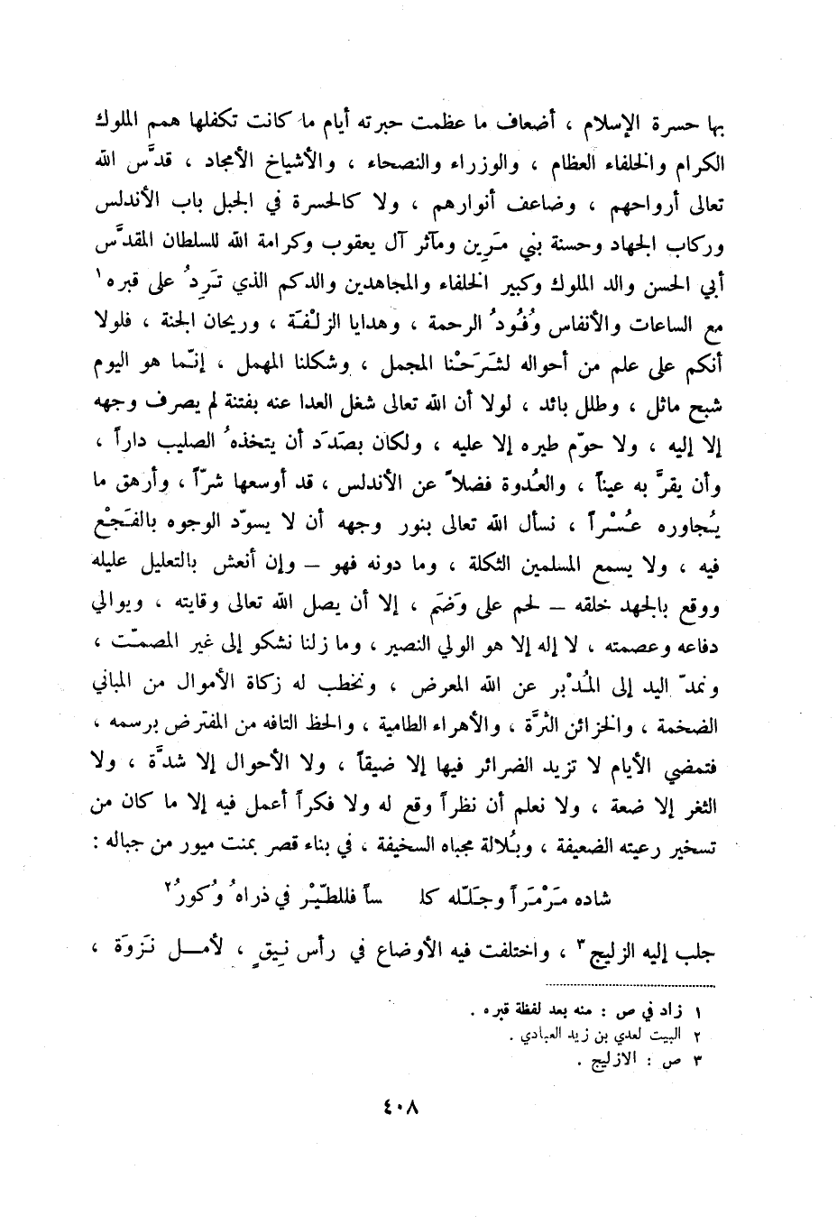 بها حسرة الإسلام، أضعاف ما عظمت حبرته أيام ما كانت تكفلها همم الملوك، الكرام والخلفاء العظام، والوزراء والنصحاء، والأشياخ الأمجاد، قدس الله تعالى أرواحهم، وضاعف أنوارهم، ولا كالحسرة في الجبل باب الأندلس، وركاب الجهاد وحسنة بني مرين ومآثر آل يعقوب وكرامة الله للسلطان المقدس أبي الحسن والد الملوك وكبير الخلفاء والمجاهدين والدكم الذي ترد على قبره (1) مع الساعات والأنفاس وفود الرحمة، وهدايا الزلفة، وريحان الجنة، فلولا أنكم على علم من أحواله لشرحنا المجمل، وشكلنا المهمل، إنما هو اليوم شبح ماثل، وطلل بائد، لولا أن الله تعالى شغل العدا عنه بفتنة لم يصرف وجهه إلا إليه، ولا حوم طيره إلا عليه، ولكان بصدد أن يتخذه الصليب داراً، وأن يقر به عيناً، والعدوة فضلاً عن الأندلس، قد أوسعها شراً، وأرهق ما يجاوره عسراً، نسألأ الله تعالى بنور وجهه أن لا يسود الوجوه بالفجع فيه، ولا يسمع المسلمين الثكلة، وما دونه فهو - وإن أنعش بالتعليل عليه ووقع بالجهد خلقه - لحم على وضم، إلا أن يصل الله تعالى وقايته، ويوالي دفاعه وعصمته، لا إله إلا هو الولي النصير، ومازلنا نشكو إلى غير المصمت، ونمد اليد إلى المدبر عن الله المعرض، ونخطب له زكاة الأموال من المباني الضخمة، والخزائن الثرة، والأهراء الطامية، والحظ التافه من المفترض برسمه، فتمضي الأيام لا تزيد الضرائر فيها إلا ضيقاً، ولا الأحوال إلا شدة، ولا الثغر إلا ضعة، ولا نعلم أن نظراً وقع له ولا فكراً أعمل فيه إلا ما كان من تسخير رعيته الضعيفة، وبلالة مجباه السخيفة، في بناء قصر بمنت ميور من جباله: