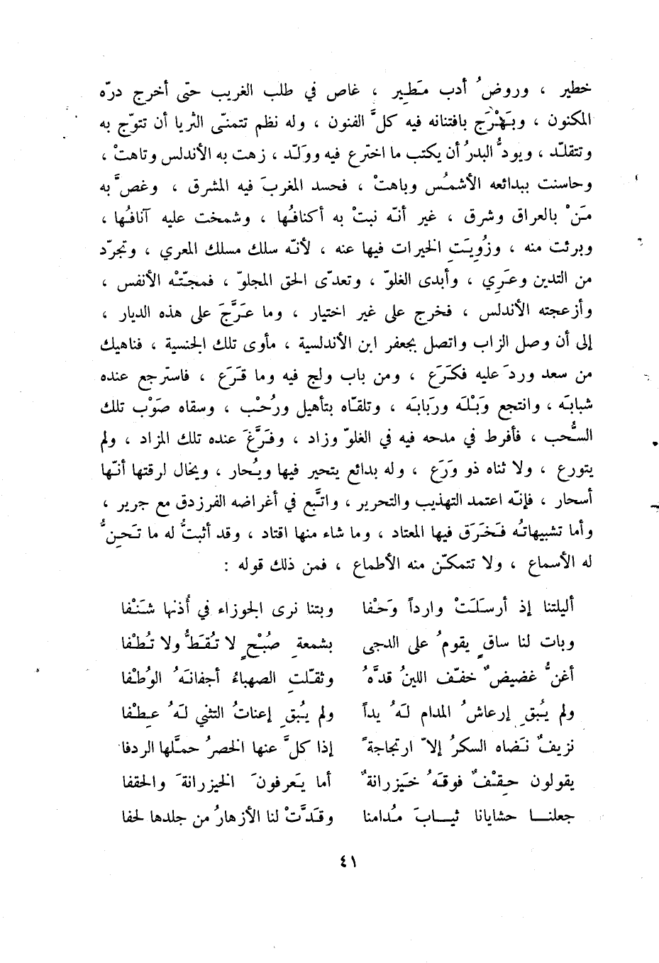 خطير، وروض أدب مطير، غاص في طلب الغريب حتى أخرج دره المكنون، وبهرج بافتنانه فيه كل الفنون، وله نظم تتمنى الثريا أن تتوج به وتتقلد، ويود البدر أن يكتب ما اخترع فيه وولد، زهت به الأندلس وتاهت، وحاسنت ببدائعه الأشمس وباهت، فحسد المغرب فيه المشرق، وغص به من بالعراق وشرق، غير أنه نبت به أكنافها، وشمخت عليه آنافها، وبرئت منه، وزويت الخيرات فيها عنه، لأنه سلك مسلك المعري، وتجرد من التدين وعري، وأبدى الغلو، وتعدى الحق المجلو، فمجته الأنفس، وأزعجته الأندلس، فخرج على غير اختيار، وما عرج على هذه الديار، إلى أن وصل الزاب واتصل بجعفر ابن الأندلسية، مأوى تلك الجنسية، فناهيك من سعد ورد عليه فكرع، ومن باب ولج فيه وما قرع، فاسترجع عنده شبابه، وانتجع وبله وربابه، وتلقاه بتأهيل ورحب، وسقاه صوب تلك السحب، فأفرط في مدحه فيه في الغلو وزاد، وفرغ عنده تلك المزاد، ولم يتورع، ولا ثناه ذو ورع، وله بدائع يتحير فيها ويحار، ويخال لرقتها أنها أسحار، فغنه اعتمد التهذيب والتحرير، واتبع في أغراضه الفرزدق مع جرير، وأما تشبيهاته فخرق فيها المعتاد، وما شاء منها اقتاد، وقد أثبت له ما تحن له الأسماع، ولا تتمكن منه الأطماع، فمن ذلك قوله: